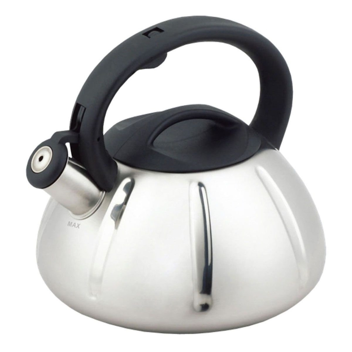 RVS fluitketel met een zwart kunststof handvat en een maximale inhoud van 3 liter.