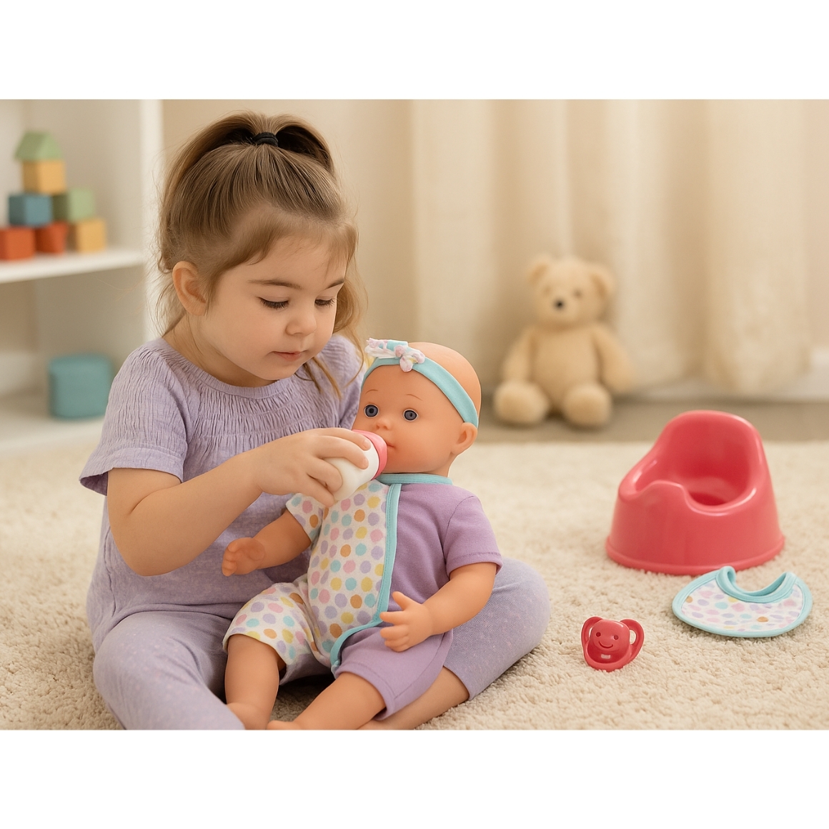 Deze schattige babypop van 30 cm heeft levensechte kenmerken en draagt een schattig pakje. De pop wordt geleverd met bijpassende accessoires en is ideaal om rollenspellen te stimuleren. Perfect geschikt voor kinderen vanaf 3 jaar die spelenderwijs willen leren zorgen. Een mooi cadeau waarmee kinderen zich urenlang kunnen vermaken.