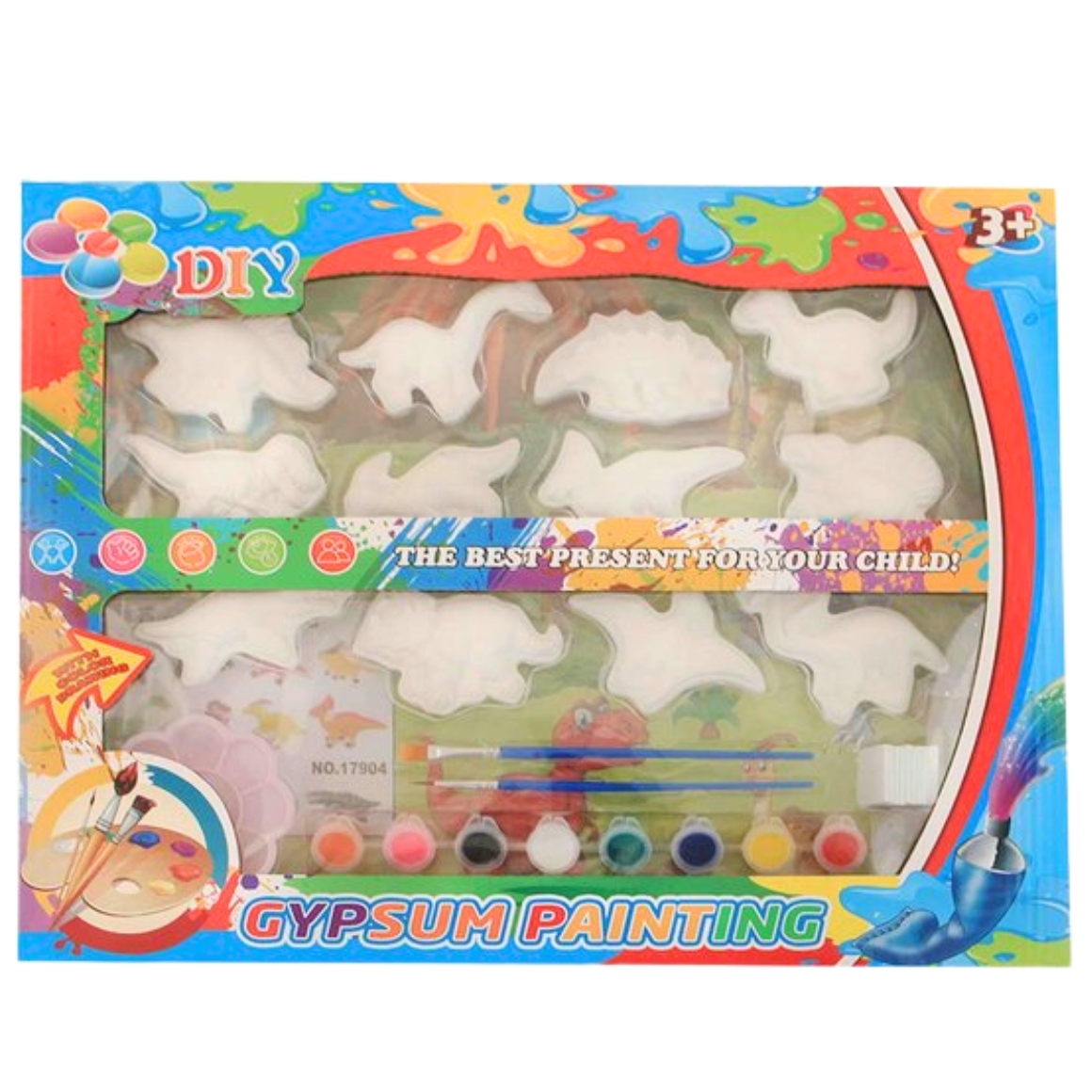 De schilderset bevat 12 dinosaurussen van gips, 8 verfpotjes in verschillende kleuren en 2 kwasten. Kinderen kunnen hun eigen prehistorische wereld tot leven brengen door de gipsdinosaurussen te schilderen. Deze complete set stimuleert creativiteit en is perfect voor jonge kunstenaars die van dinosaurussen houden en graag knutselen. Niet geschikt voor kinderen onder 3 jaar vanwege kleine onderdelen.