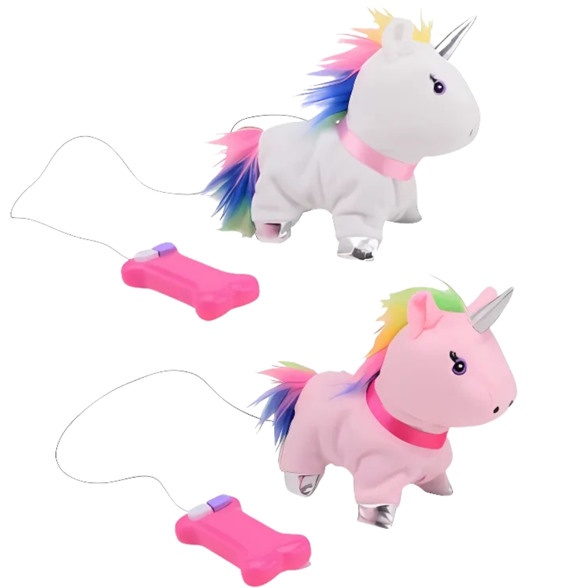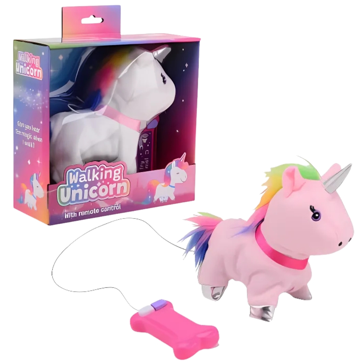 Deze schattige lopende eenhoorn van 16 cm maakt geluid en wordt bediend met een afstandsbediening via draad. Beschikbaar in roze of wit en voorzien van een kleurrijke manen en staart. Werkt op 2 AA-batterijen (niet inbegrepen). Geschikt voor kinderen vanaf 3 jaar.