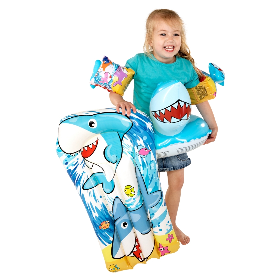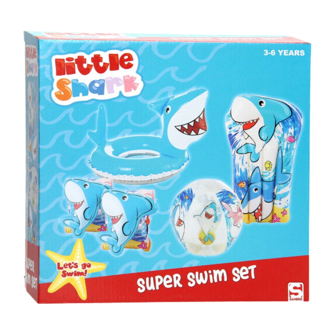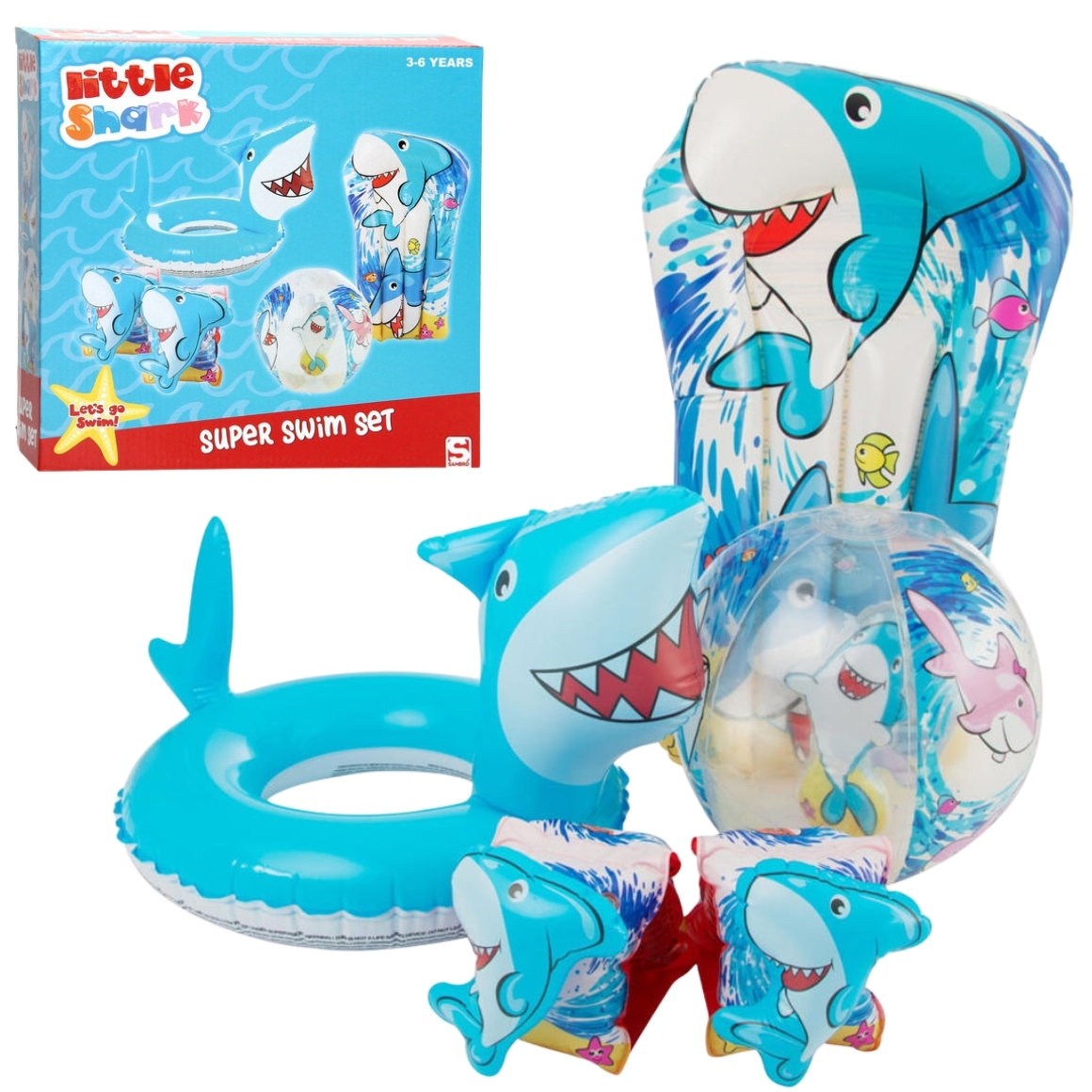 Deze vrolijke 5-delige zwemset in Little Shark-thema is ideaal voor jonge waterratjes van 3 tot 6 jaar. De set bestaat uit een zwemband, zwembandjes, luchtbed en strandbal – allemaal met stoere haaienprint in frisse blauwtinten. Perfect voor een dagje aan het zwembad of strand.