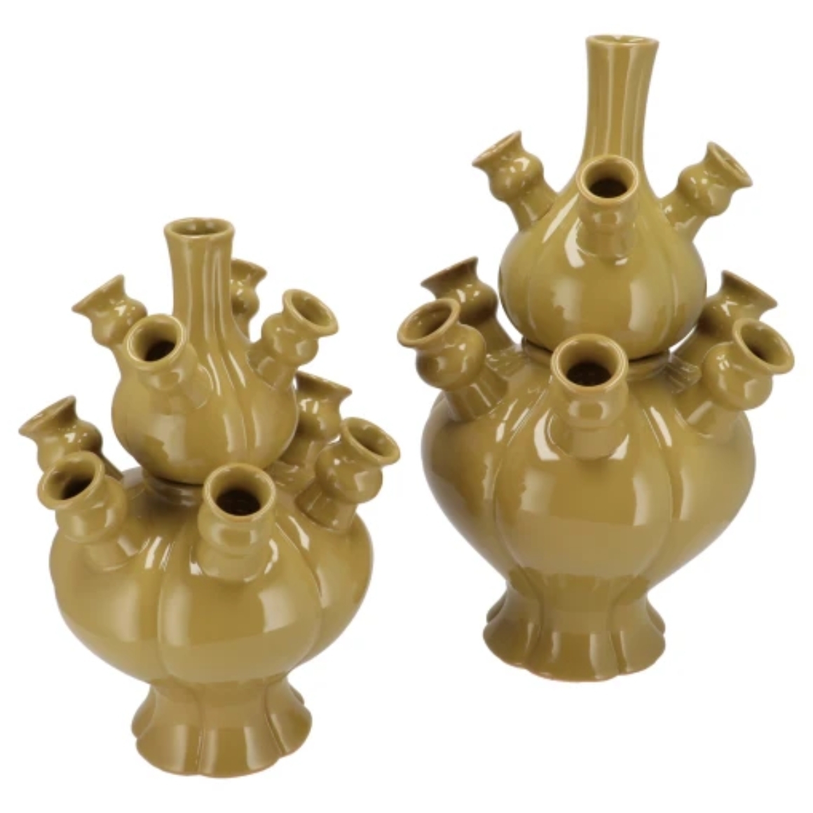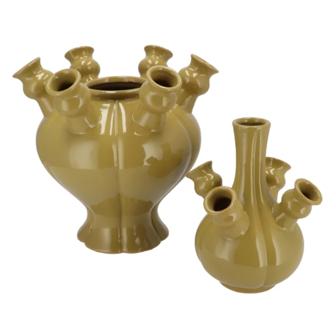 Set van 2 keramieken vazen Rotterdam in groene kleur met een maximale hoogte van 36 cm. De vazen hebben meerdere openingen en een glanzende afwerking. Ze kunnen op elkaar geplaatst of los van elkaar gebruikt worden en bieden daarmee veelzijdige mogelijkheden voor creatieve bloemstukken en interieurdecoratie.