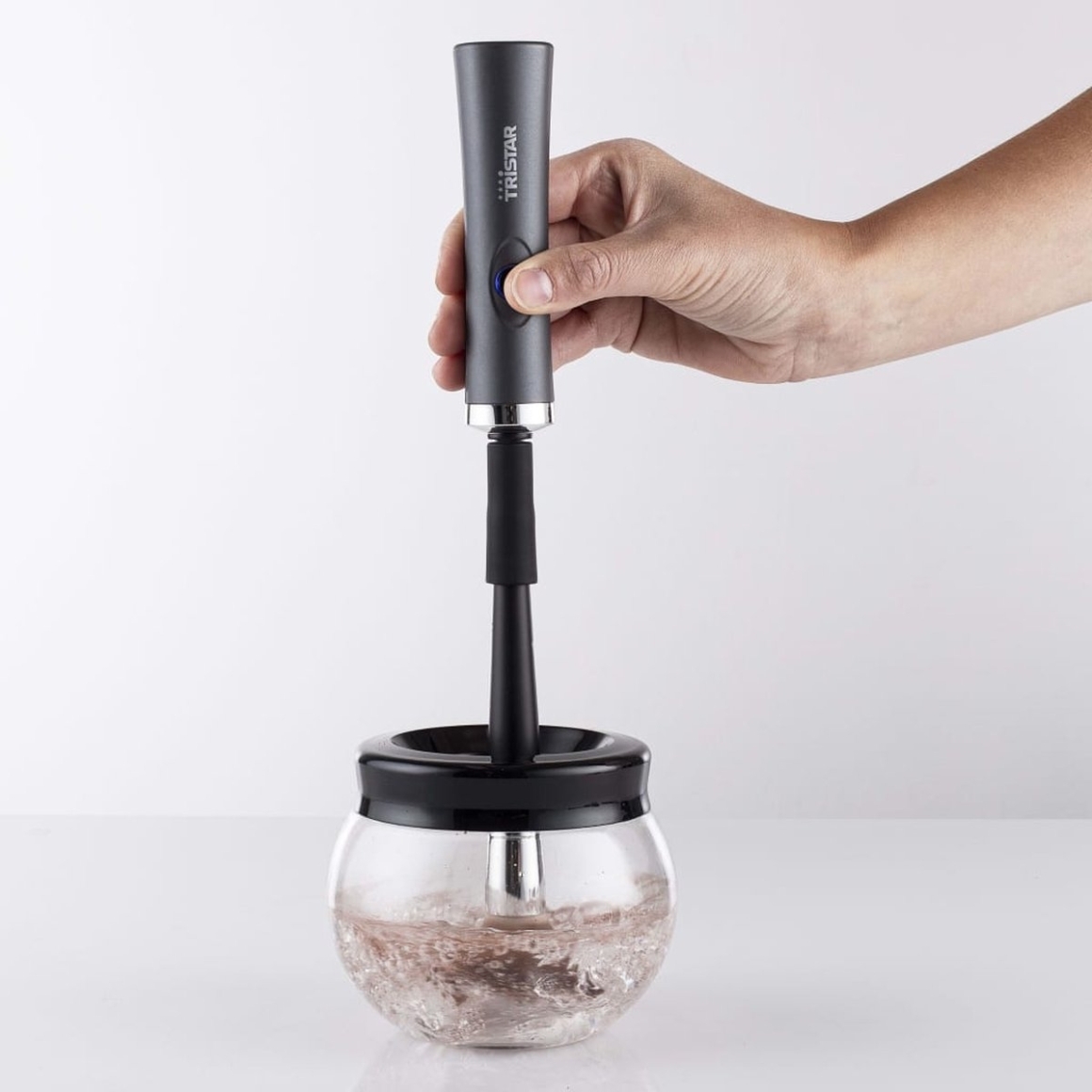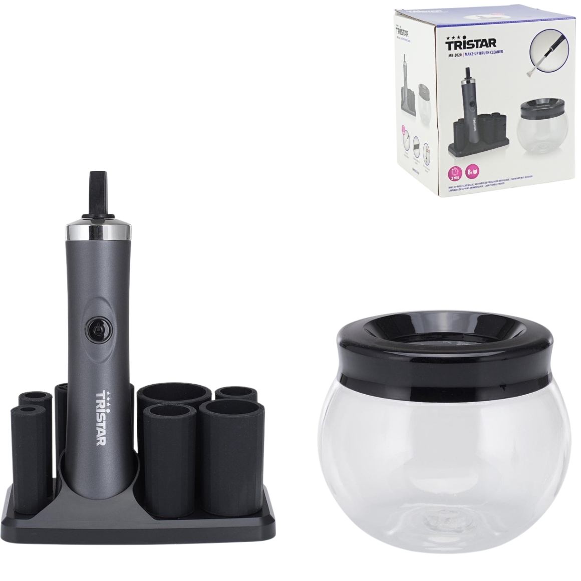 De Tristar make-up kwastenreiniger reinigt uw kwasten grondig in slechts 2 minuten. Dankzij de 8 meegeleverde rubberen houders is het apparaat compatibel met diverse maten kwasten. Het transparante waterreservoir is eenvoudig schoon te maken. Werkt op 2 x AAA-batterijen (niet inbegrepen), ideaal voor snel en draadloos gebruik.