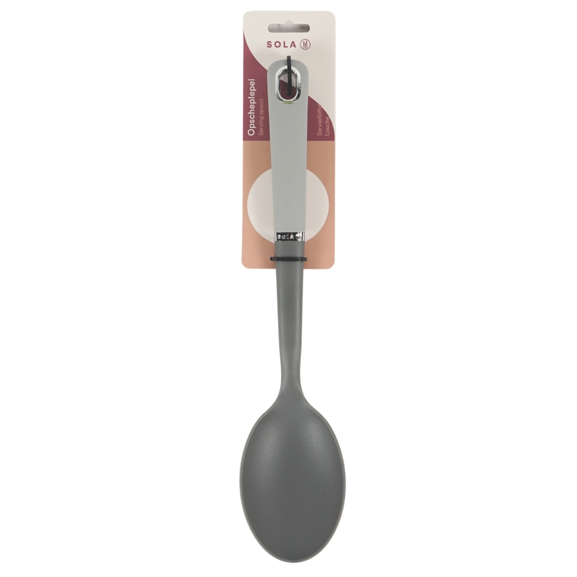 Deze grijze serveerlepel van Sola is een onmisbare hulp bij het opscheppen en serveren van groenten, pasta of andere warme gerechten. De lepel is gemaakt van stevig kunststof en heeft een ergonomisch handvat met soft grip van siliconen. Met een totale lengte van 33 cm ligt deze lepel prettig in de hand en biedt hij voldoende bereik. Dankzij de slimme opstaande rand raakt de lepel het aanrecht niet, wat zorgt voor hygiënisch gebruik. Voorzien van een verchroomd ophangoog. Hittebestendig tot 210 graden en geschikt voor de vaatwasser.