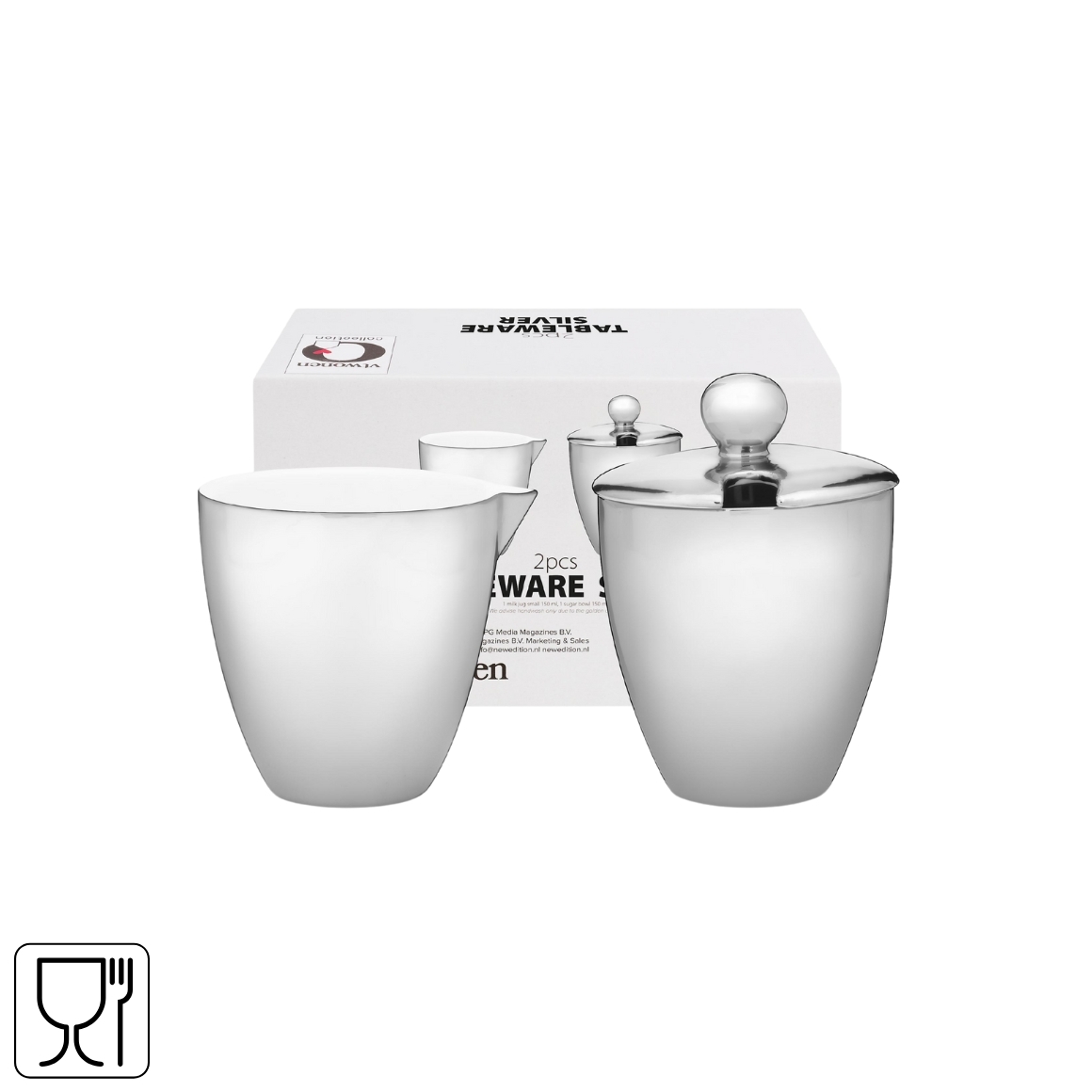 Roomstel uit de Silver serie van VTwonen, bestaande uit melkkan en suikerpot. Gemaakt van porselein met een zilverkleurige afwerking voor een luxe uitstraling. Inhoud per onderdeel 150 ml. Foodsafe en ideaal voor een stijlvolle tafelpresentatie. Niet geschikt voor vaatwasser of magnetron.