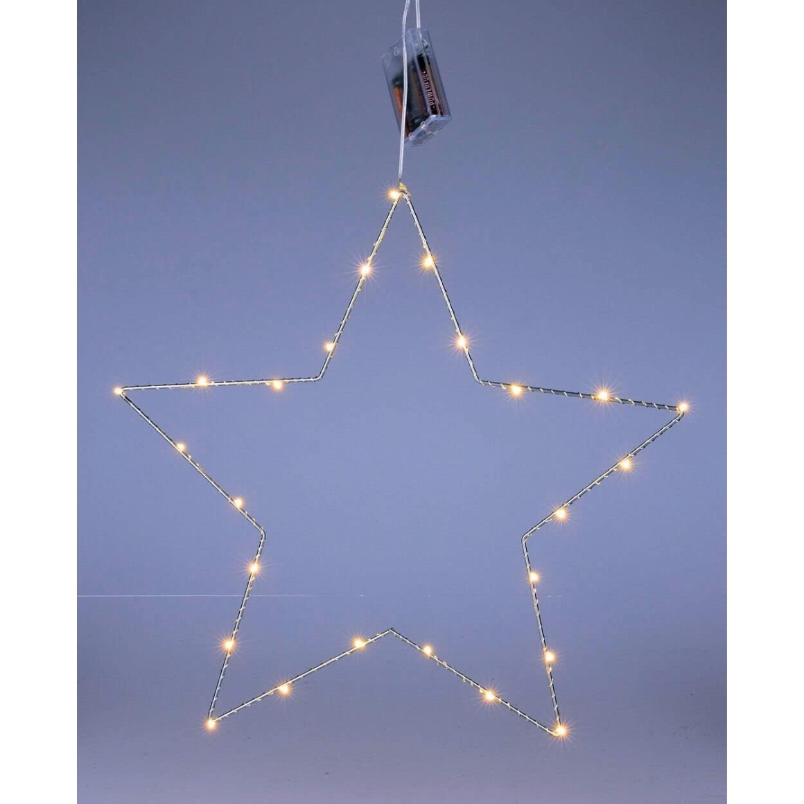 Deze kerstster met verlichting heeft een metalen frame met daaromheen gespannen 25 warmwitte LEDs. Voorzien van een ophangoog om als raamdecoratie te gebruiken. Werkt op 3 AA batterijen (niet inbegrepen) en is uitgerust met een aan/uit-schakelaar op het batterijvak.