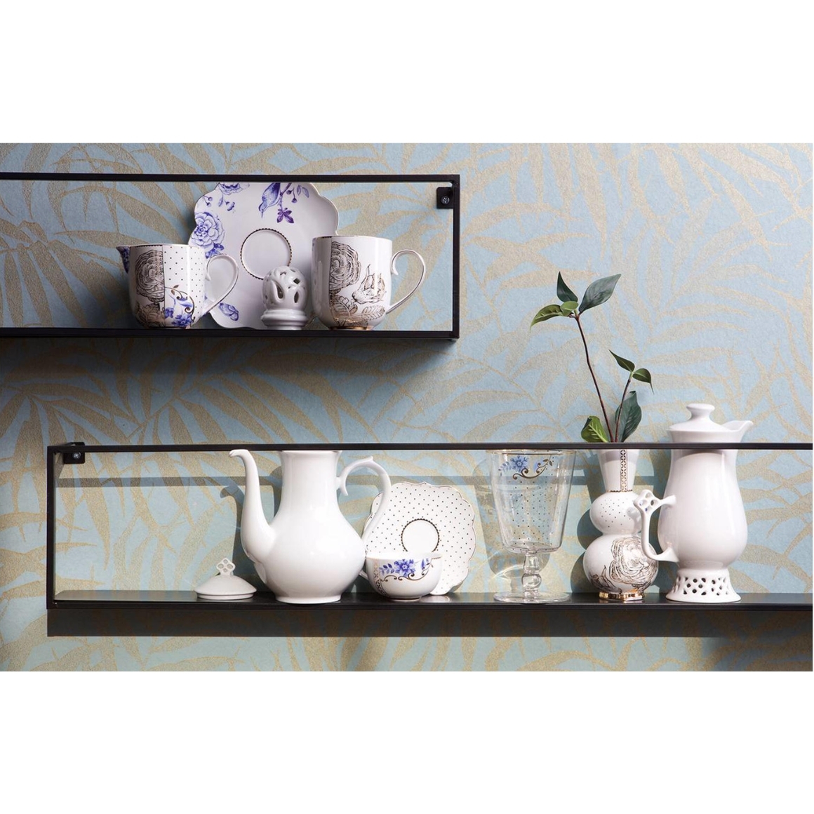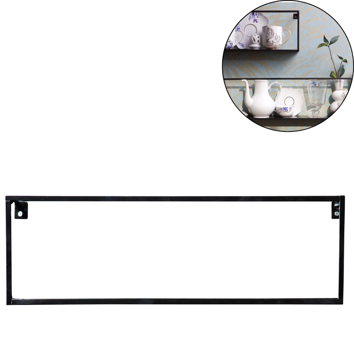 Metalen wandrek in zwarte kleur, ideaal voor het stijlvol presenteren van accessoires of servies. Past in elk interieur dankzij het strakke design. Eenvoudig aan de muur te bevestigen.