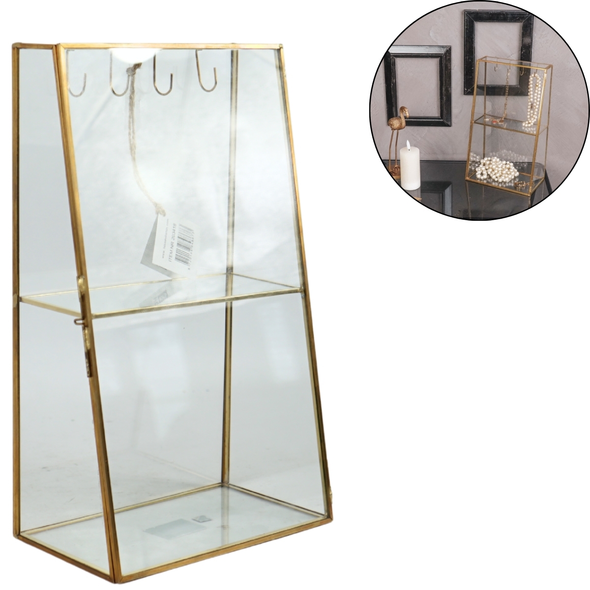Dit goudkleurige sieraden opbergkastje van 31 cm heeft meerdere haken voor het ophangen van kettingen of armbanden. Het transparante ontwerp maakt het eenvoudig om sieraden overzichtelijk te presenteren en stijlvol op te bergen.