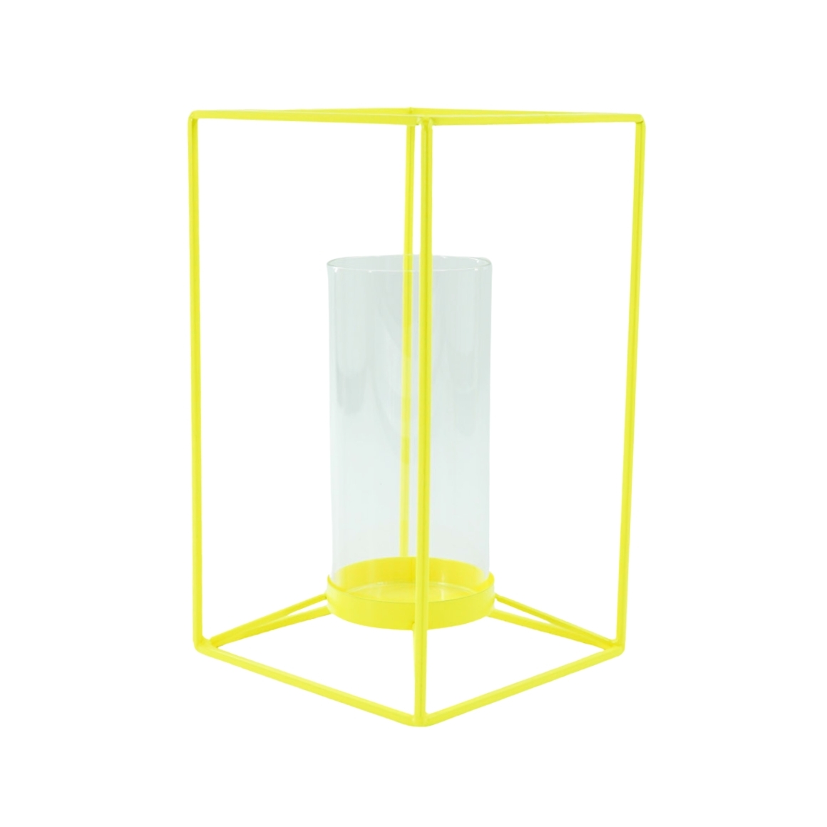 Housevitamin lantaarn van metaal in fel gele kleur met moderne uitstraling. De lantaarn is 20 cm hoog en voorzien van een losse glazen inzet voor theelichten. Geschikt voor gebruik op tafel, vensterbank of terras en zorgt voor een sfeervol, warm licht.
