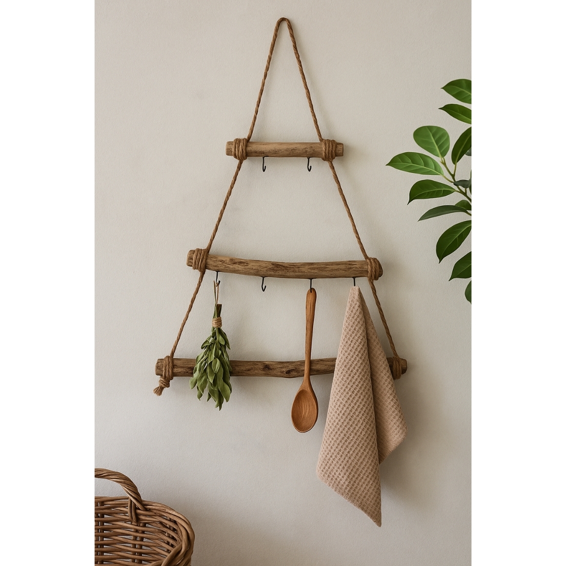 Decoratieve wandhanger in de vorm van een kerstboom, gemaakt van hout met touw. Voorzien van meerdere metalen haken voor het ophangen van kerstballen, decoraties of accessoires. Hoogte ca. 70 cm.