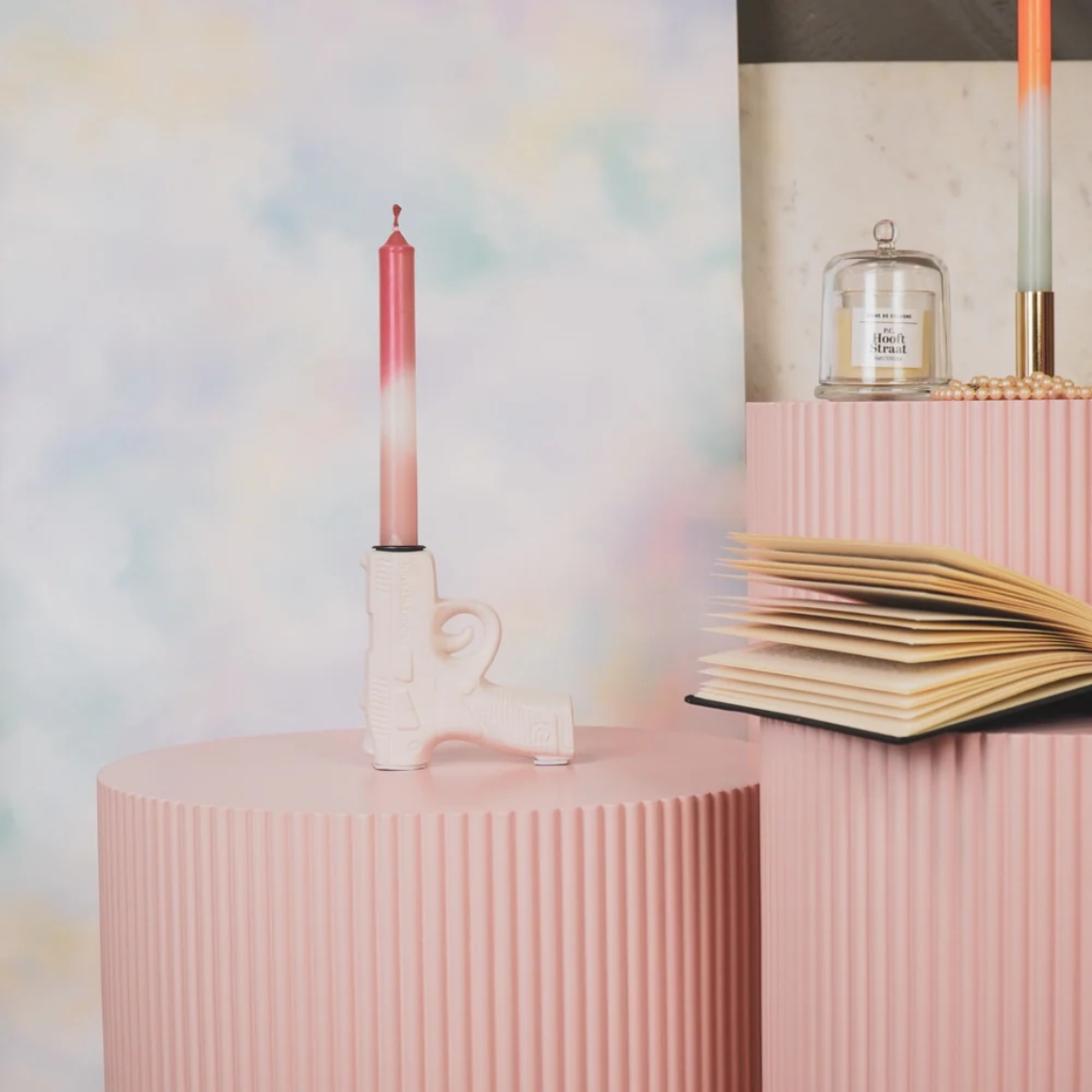 Keramische kaarsenhouder in de vorm van een pistool, met een hoogte van 12 cm. Geschikt voor standaard dinerkaarsen met een diameter van 22 mm. Een opvallend decoratief object dat zorgt voor een eigentijdse en speelse uitstraling in elk interieur.
