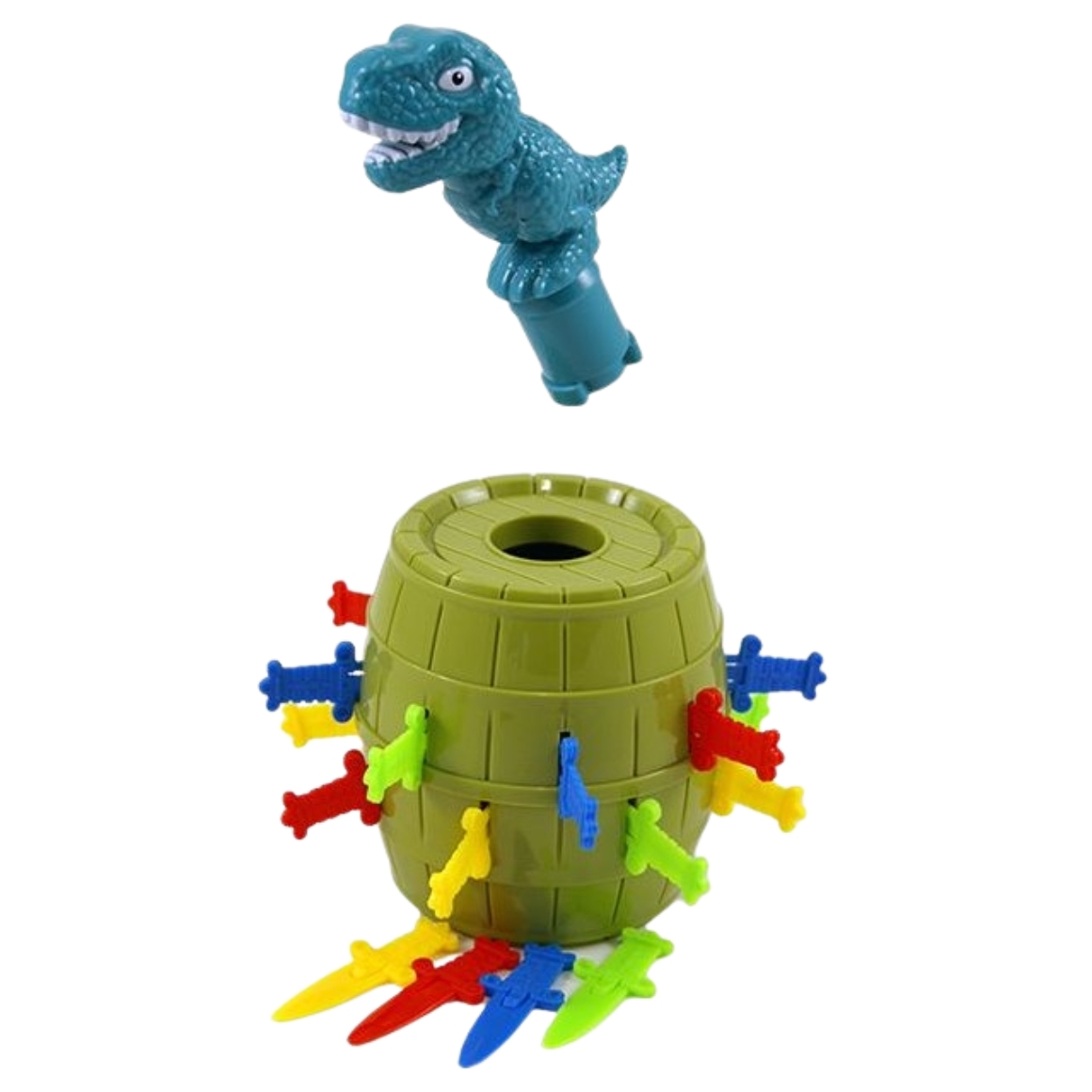 Kinderspel waarbij een dinosaurus uit de ton springt. Plaats om de beurt een stokje in de ton en wacht op het spannende moment dat de dinosaurus tevoorschijn komt. Leuk voor kinderen en gezinnen, geschikt voor meerdere spelers.