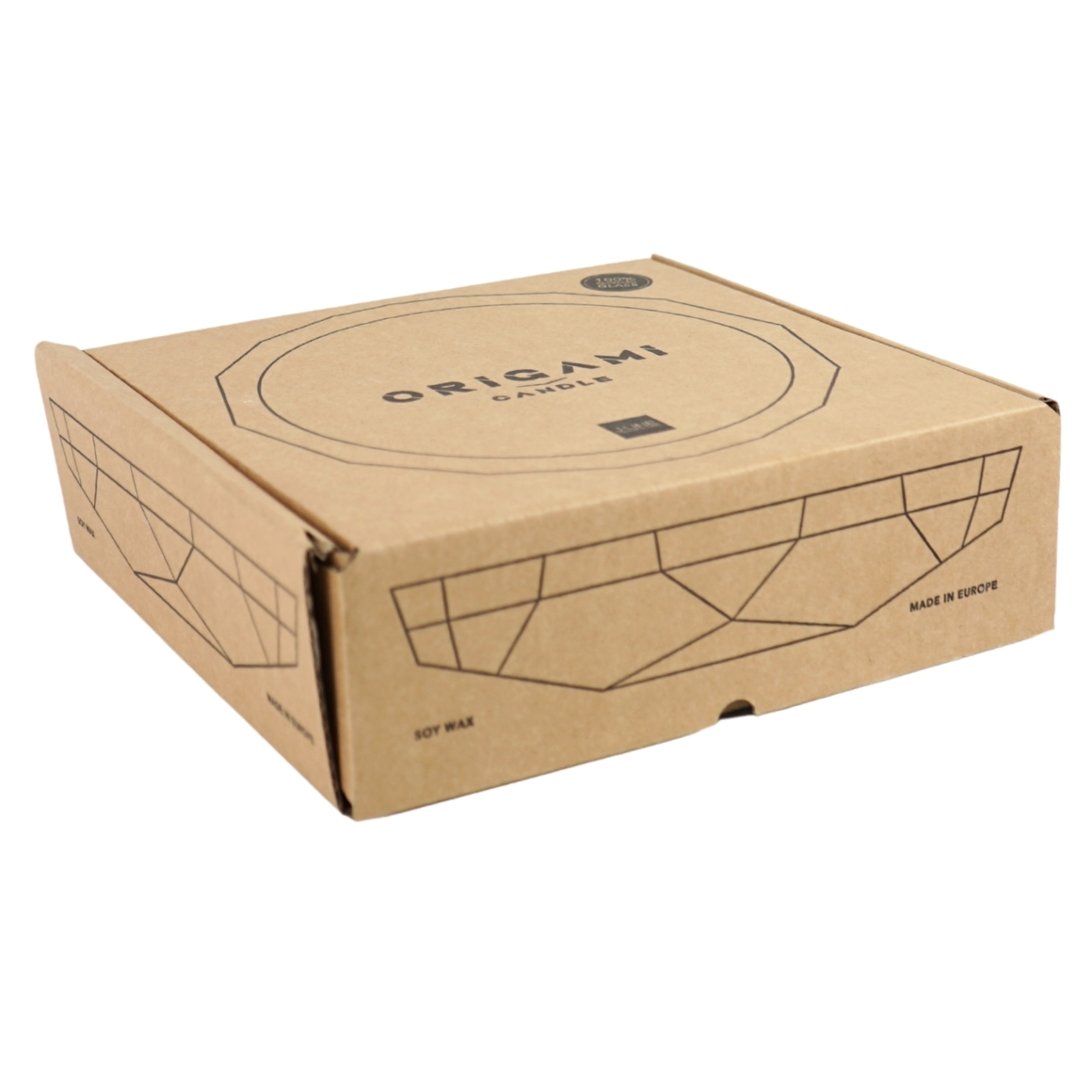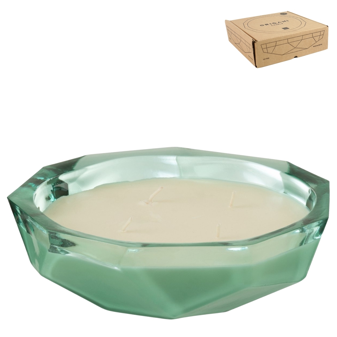 Kaars in schaalvorm Origami in groen transparant glas met schaal met reliefpatroon, gemaakt van 100% gerecycled glas. De meerdere lonten zorgen voor een brede, rustige gloed op tafel, salontafel of dressoir en maken de schaal tot een sfeervol middelpunt in de ruimte. Brandtijd circa 27 uur.