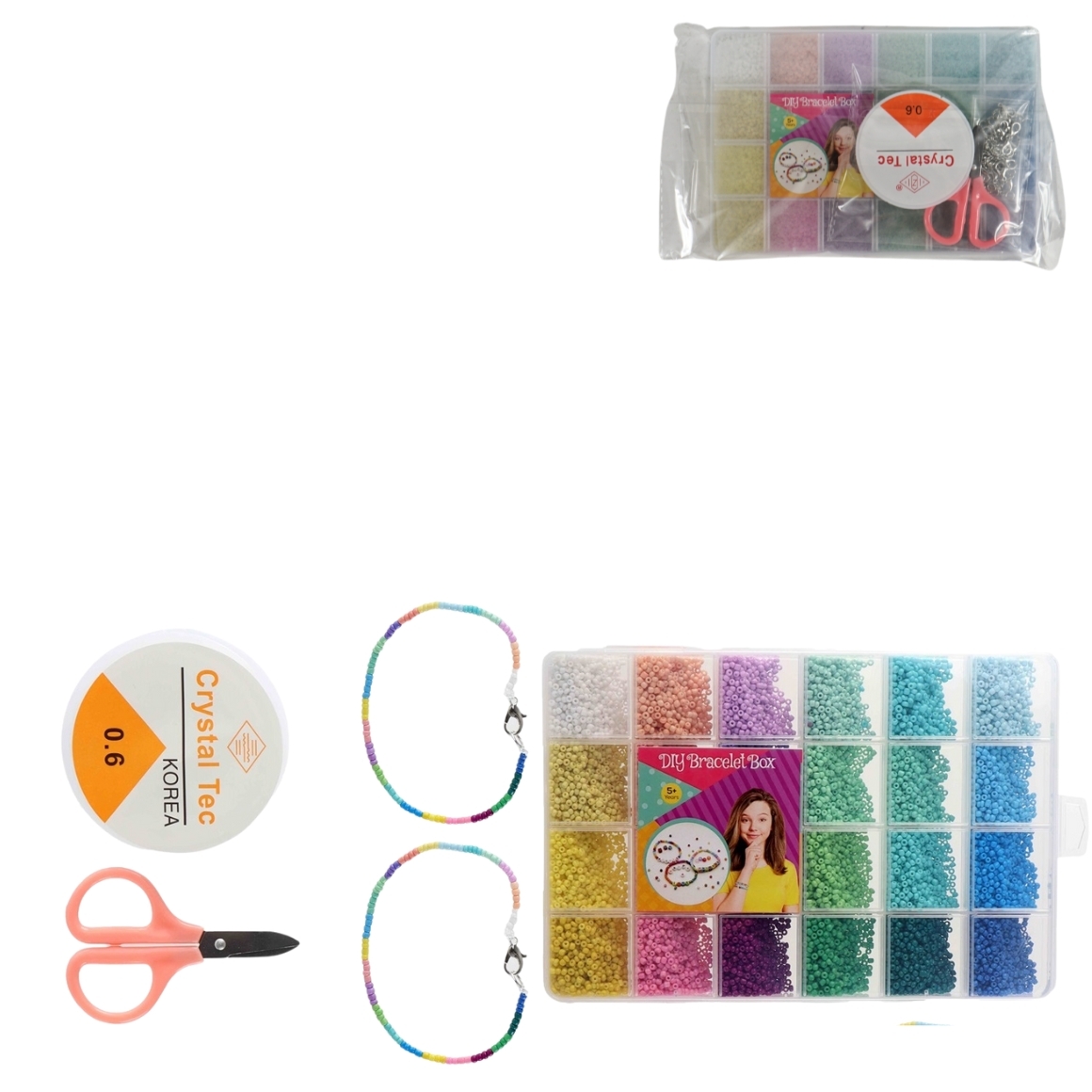 Ontdek je creatieve kant met deze leuke DIY kralenset! De set bevat 24 verschillende kleuren kralen, elastisch rijgdraad, metalen ringetjes en een schaar. Perfect voor creatief knutselen en het ontwerpen van je eigen unieke sieraden. Geschikt voor kinderen vanaf 5 jaar.