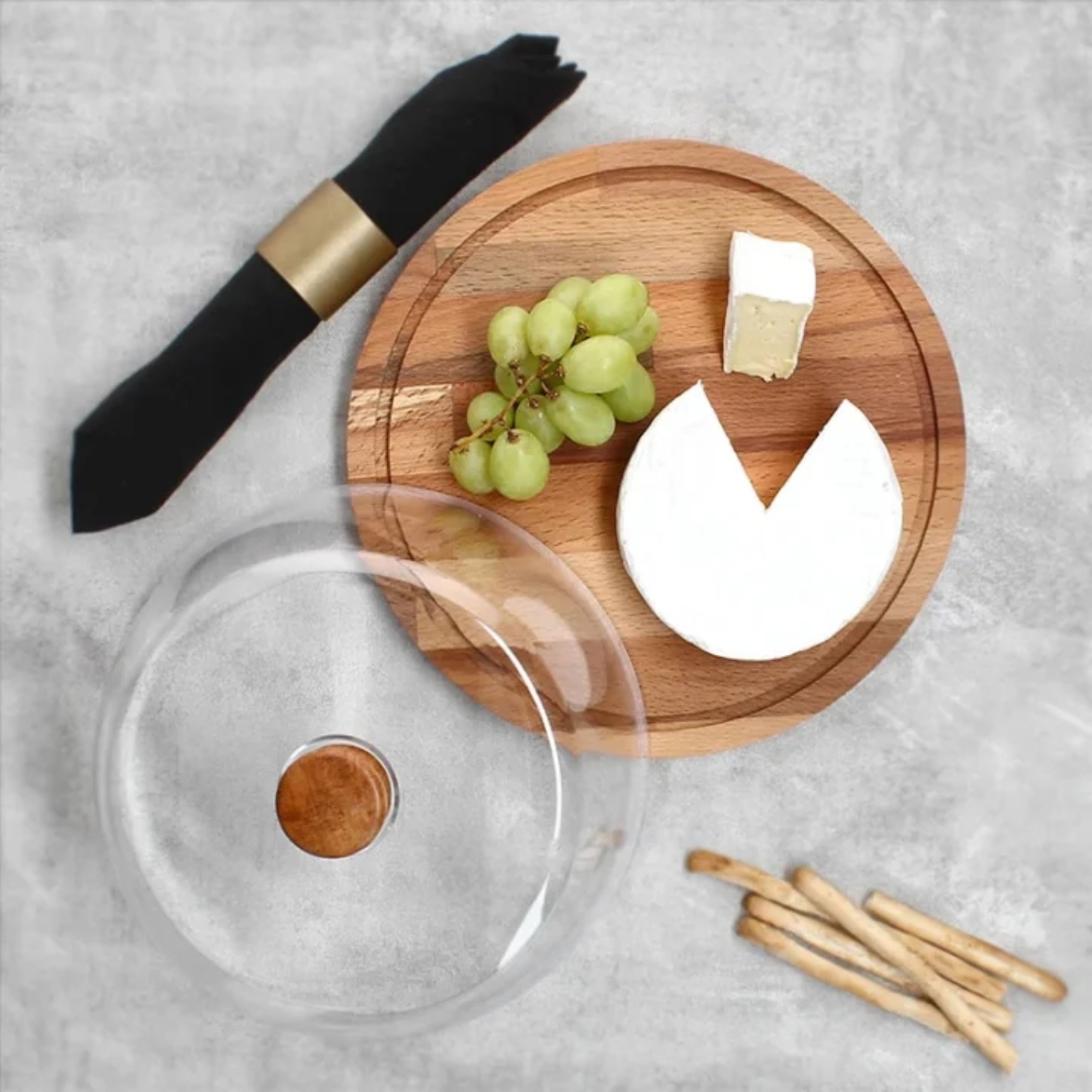 Ronde houten serveerplank met glazen stolp. Ideaal voor het stijlvol serveren van taart, kaas of hapjes. De natuurlijke materialen geven een warme, elegante uitstraling die past bij elke tafelsetting.
