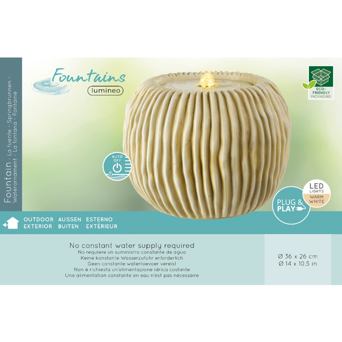 Ronde buitenfontein van Lumineo met EU-stekker en IP44-classificatie. Voorzien van warm witte LED-verlichting, transformator en pomp met instelbaar watervolume en automatische uitschakeling. Afmetingen: Ø36 x H26 cm. Gemaakt in ribbelstructuur met cactusvormig design en CE-keurmerk.
