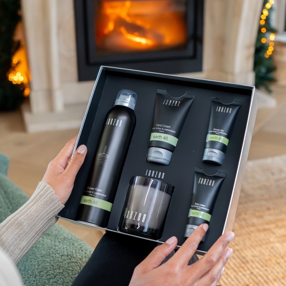 Luxe giftset van Janzen in de geur Earth 46 met een warme, kruidige toon. De set bevat vijf verzorgingsproducten: Shower Foam (200 ml), Hand Cream (75 ml), Body Lotion (40 ml), Shower Gel (40 ml) en een geurkaars. Perfect als cadeau of voor een verwenmoment thuis.