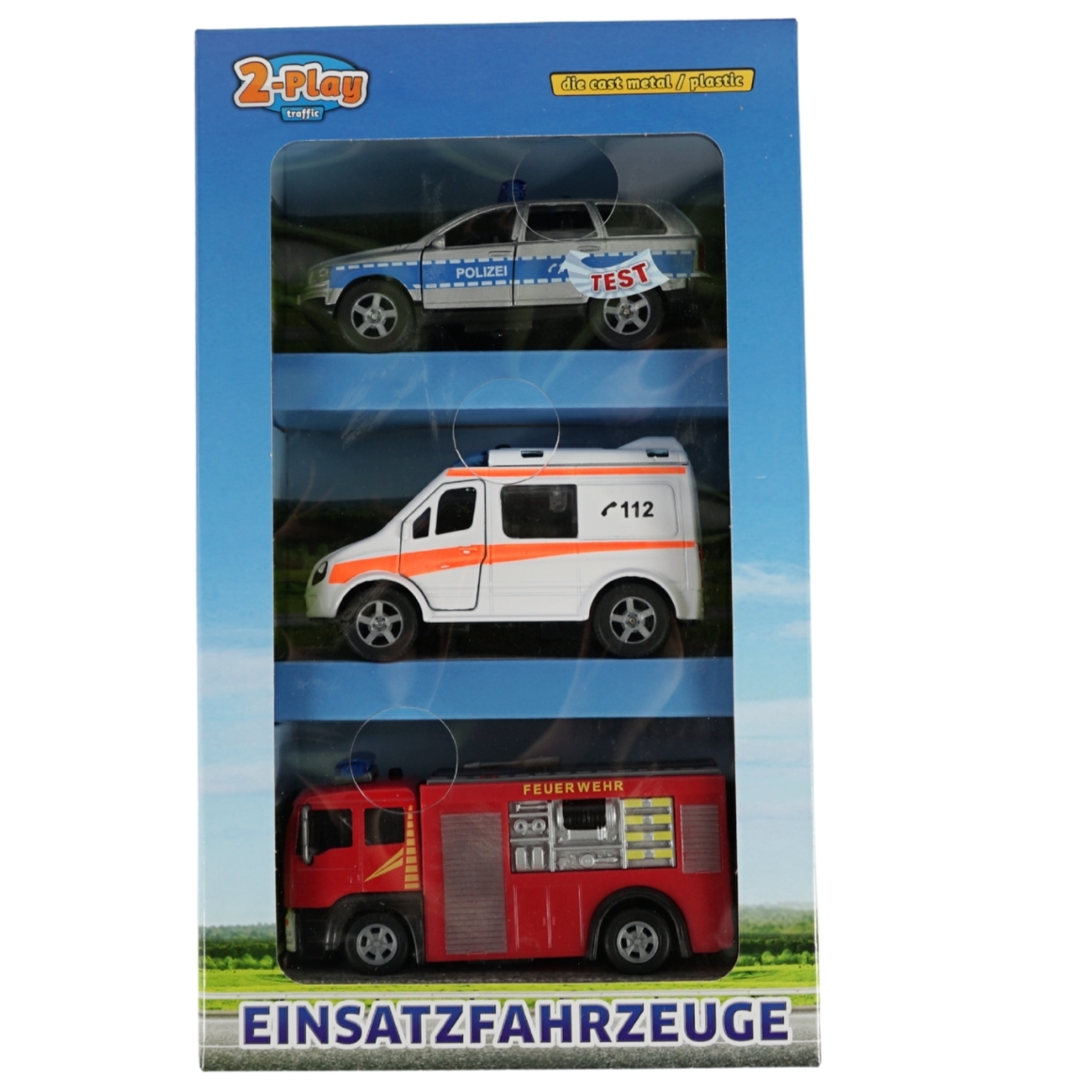 Artikel wordt geleverd als set van drie voertuigen. Deze 2-Play hulpdienstenset bestaat uit een politieauto, ambulance en brandweerwagen. De voertuigen zijn gemaakt van die-cast metaal en kunststof, beschikken over een pull-back functie, licht en geluid (inclusief 3x LR44 batterijen), en hebben deuren die open kunnen. Geschikt voor kinderen vanaf 3 jaar.