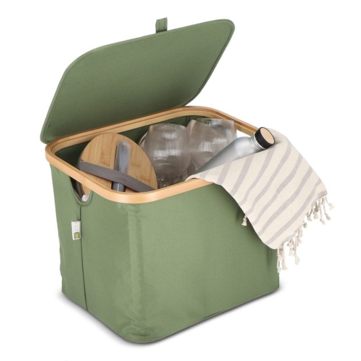 Compacte vouwmand Sogne van InSideOut, gemaakt van gerecyclede materialen en bamboe. Voorzien van deksel en textielverstevigde hoeken met klittenbandsysteem. Opvouwbaar en stapelbaar voor ruimtebesparende opslag. Ideale duurzame oplossing voor het netjes opbergen van was of huishoudelijke spullen.