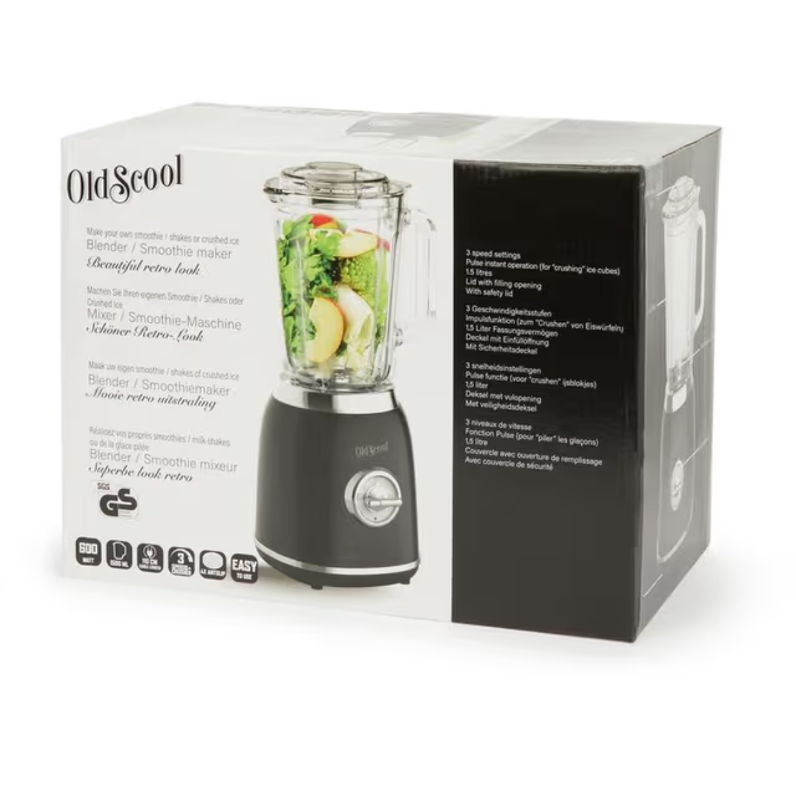 Krachtige blender van Old Scool met een motor van 600 watt en een grote glazen kan van 1,5 liter. Uitgevoerd in retrodesign met 2 snelheden en een ijscrusherfunctie. Dankzij de handige vulopening kun je eenvoudig ingrediënten toevoegen tijdens het mengen. Ideaal voor smoothies, shakes, sauzen en crushed ijs. Veilig, stabiel en gebruiksvriendelijk.