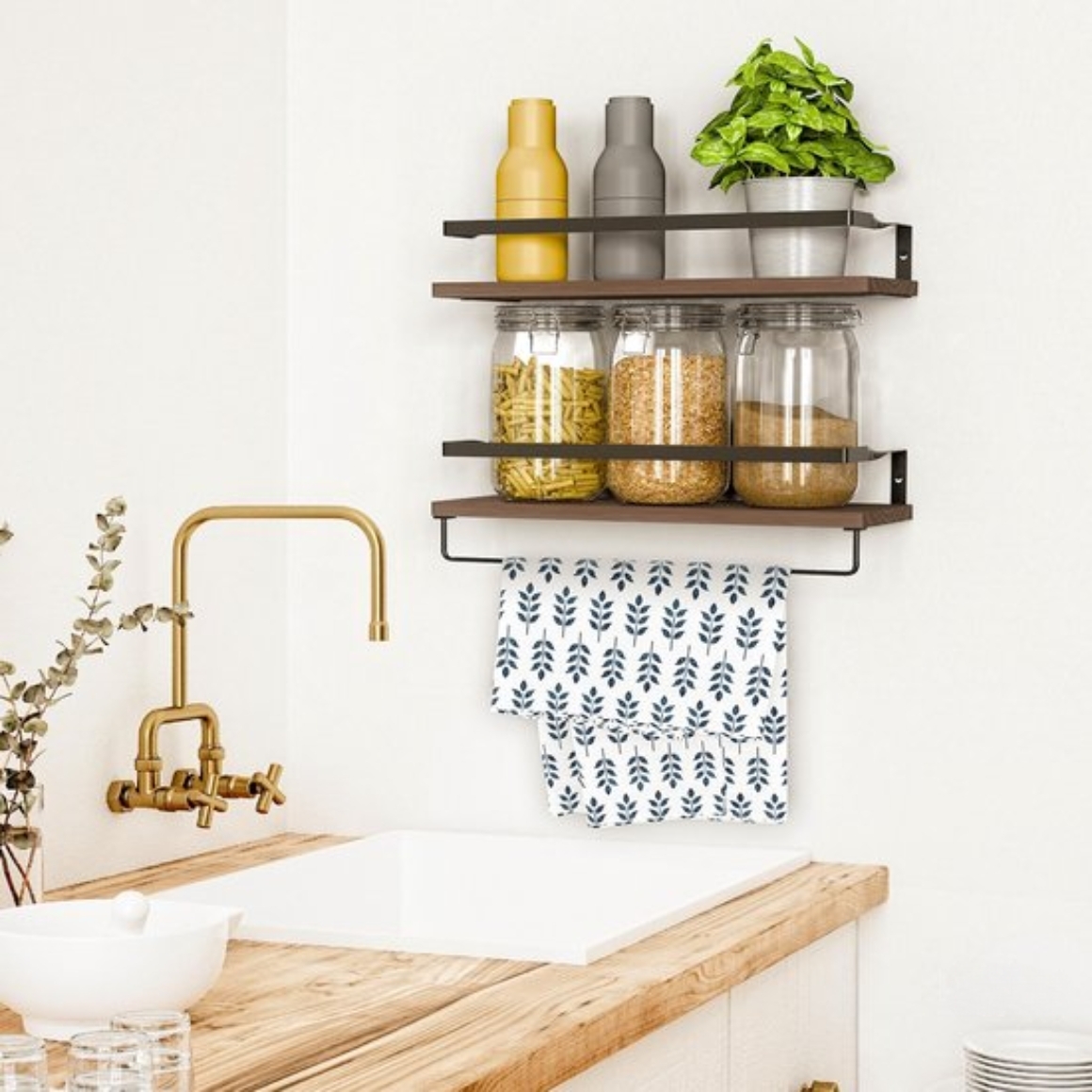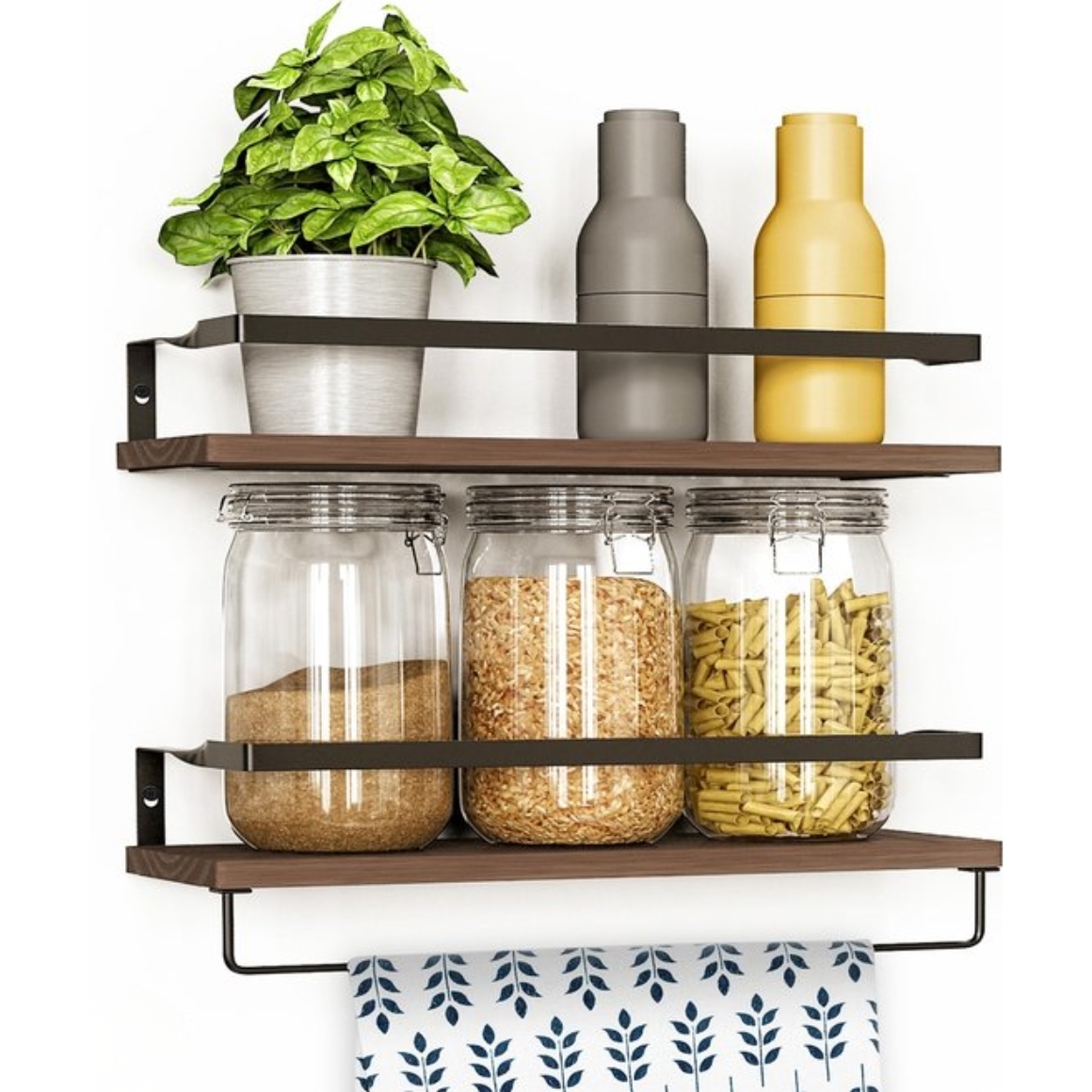 Set van 2 stijlvolle wandplanken gemaakt van dennenhout (35 mm dik) en metaal (3 mm dik). De combinatie van hout en zwart staal geeft een industriële uitstraling die past in elk interieur. Ideaal voor het opbergen van handdoeken, shampoo, kruiden, planten of boeken. De planken zijn vochtbestendig en daardoor ook geschikt voor gebruik in de badkamer. Inclusief handdoekenrek van 36,5 x 5,5 cm, dat eenvoudig kan worden bevestigd of verwijderd. Afmeting per plank 41 x 14,7 cm. Wordt geleverd met schroeven, pluggen en schroevendraaier voor snelle montage.