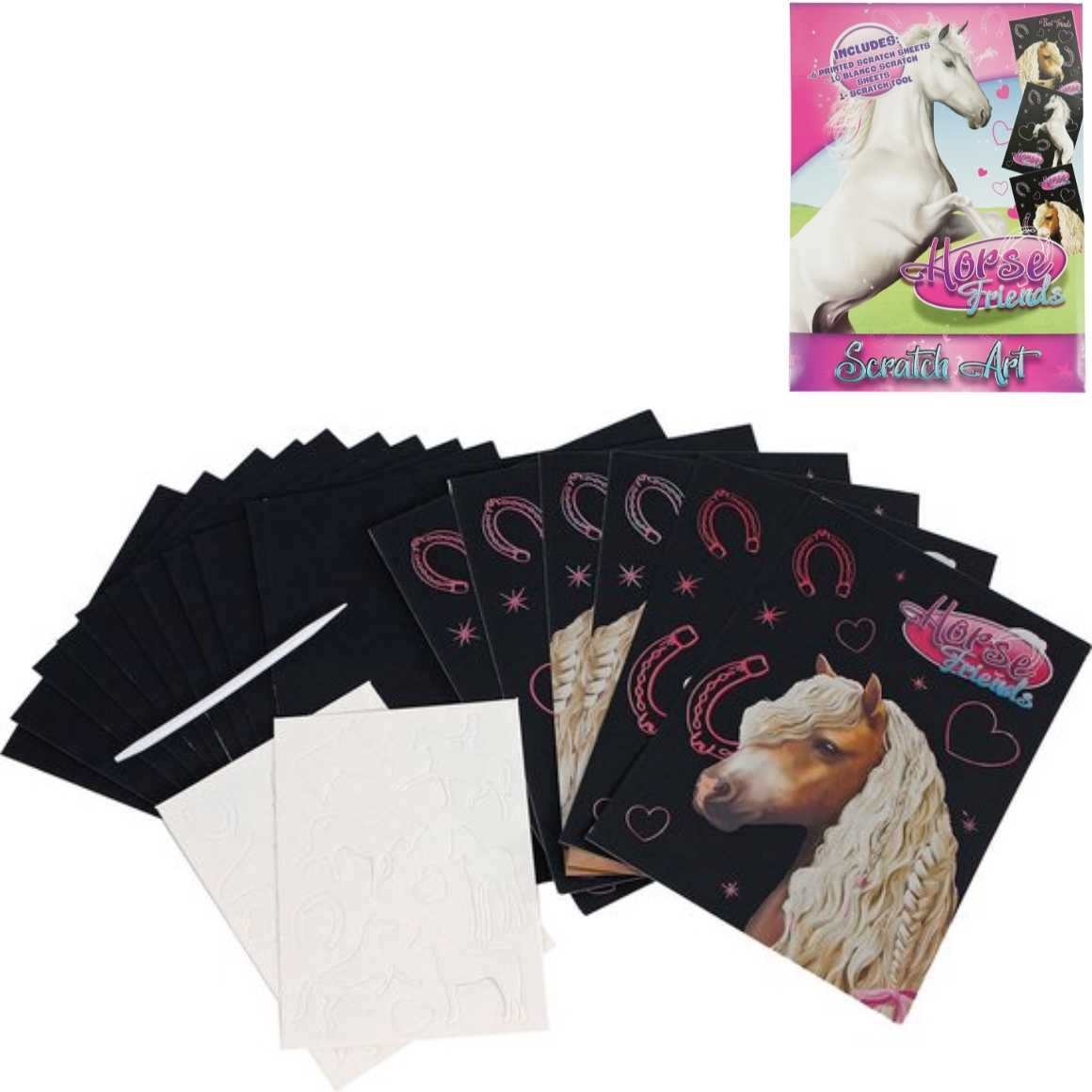 Met de kraskaarten van Horse Friends kras je de mooiste afbeeldingen tevoorschijn! Wat er onder de zwarte laag verstopt zit, is een verrassing. De set bestaat uit zes geprinte kraskaarten met paardenafbeeldingen, tien blanco kraskaarten en één kraspen. Ideaal voor creatieve kinderen die van paarden houden! De kaarten zijn gemaakt van papier en hebben een afmeting van 21 x 15,5 cm.