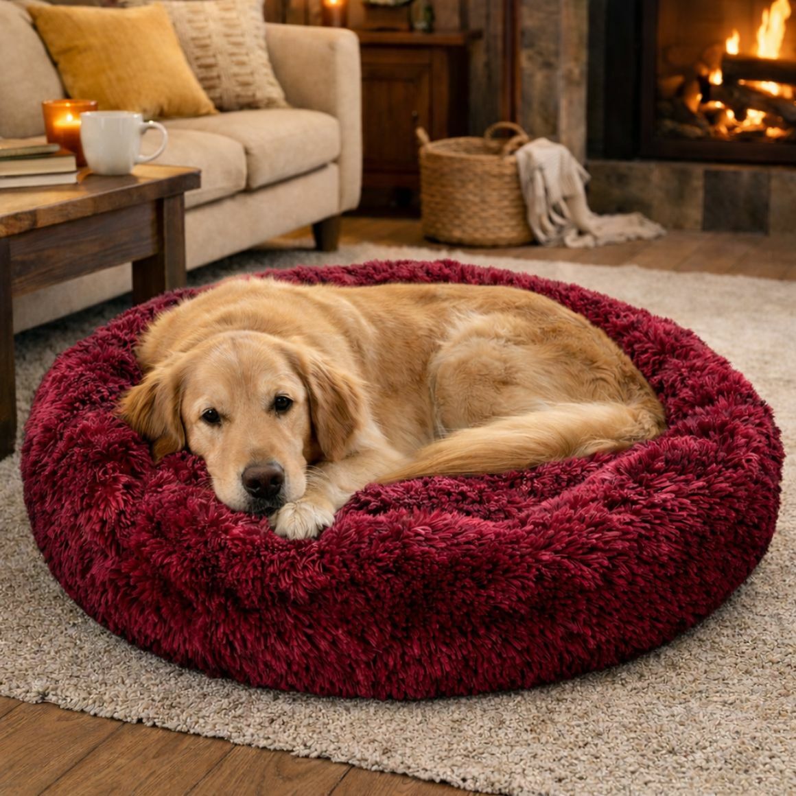 De Hondenmand XL Donut in bordeaux met een diameter van 100 cm biedt een comfortabele en warme ligplek voor grote honden. De fluffy bekleding voelt super zacht aan en zorgt voor extra comfort tijdens rustmomenten. Dankzij de opstaande rand krijgt de hond extra ondersteuning. De antislip onderzijde zorgt ervoor dat de mand stabiel op zijn plaats blijft liggen.