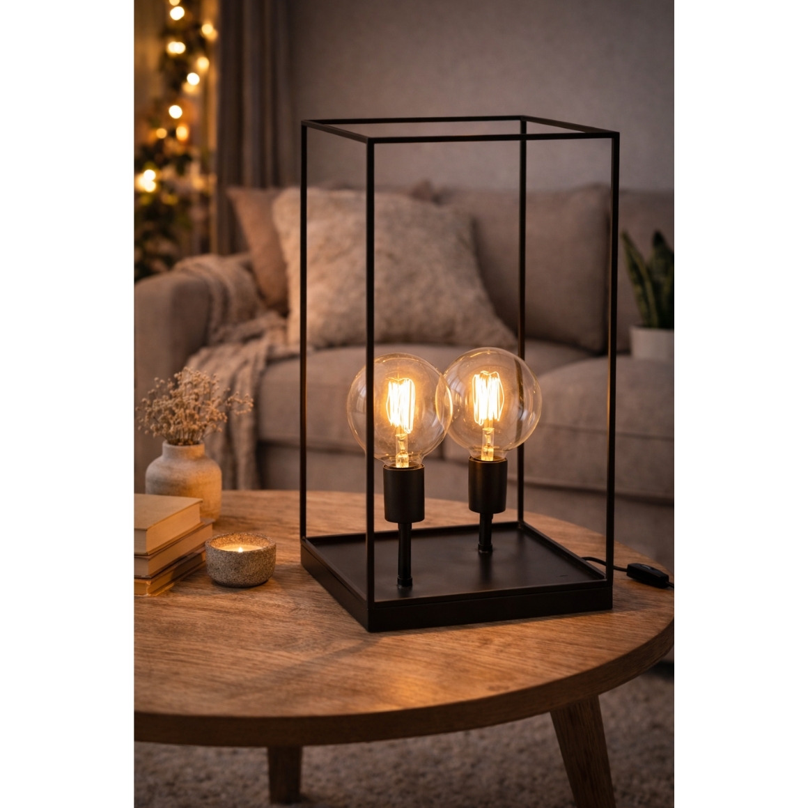 Moderne tafellamp van het merk J-Line in zwart met een hoogte van 50 cm. Het open metalen frame geeft een strakke uitstraling en biedt ruimte voor twee lichtbronnen. Uitgevoerd met E27-fitting, max. 25W per fitting. Voorzien van een snoer van ca. 163 cm met aan/uit schakelaar en EU-stekker.