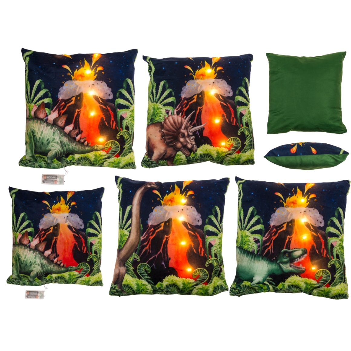 Het Out of the Blue Dino kussen is een zacht decoratief kussen met een dino thema en een vulkaan met LED verlichting. De verlichting geeft een speels lichteffect en maakt het kussen geschikt voor de kinderkamer. Formaat circa 40 x 40 cm. Werkt op 2 x AA batterijen (niet inbegrepen). Niet geschikt voor de wasmachine.