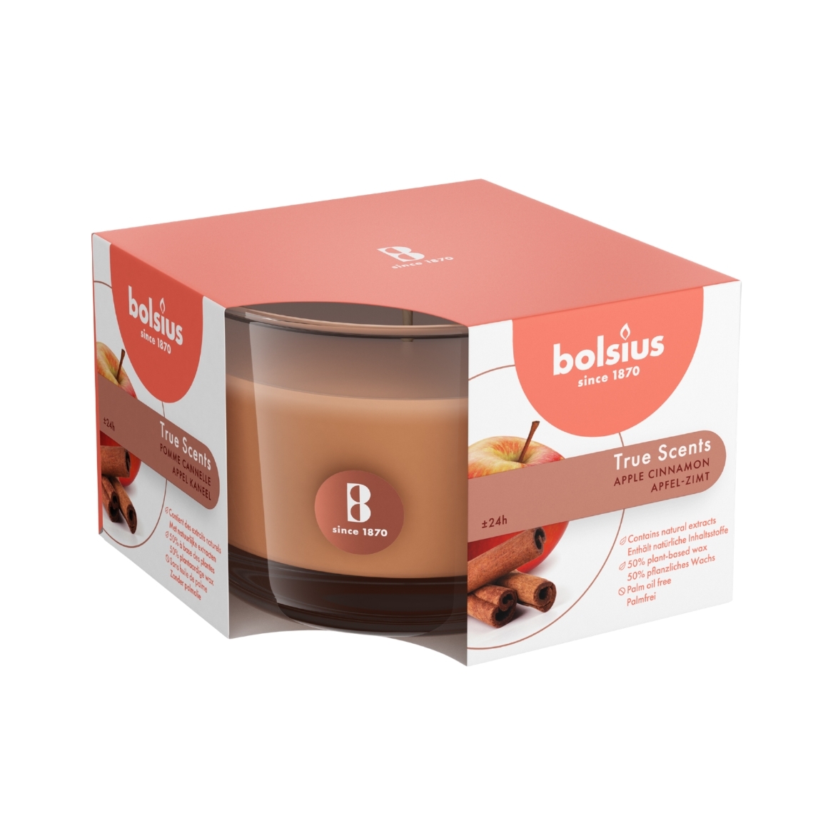 Sfeervolle geurkaars van Bolsius in glas met appel kaneel geur. De warme en kruidige geur zorgt voor een gezellige en uitnodigende ambiance. De kaars is geschikt voor dagelijks gebruik en ideaal voor het creeren van een warme sfeer in huis of als cadeau.