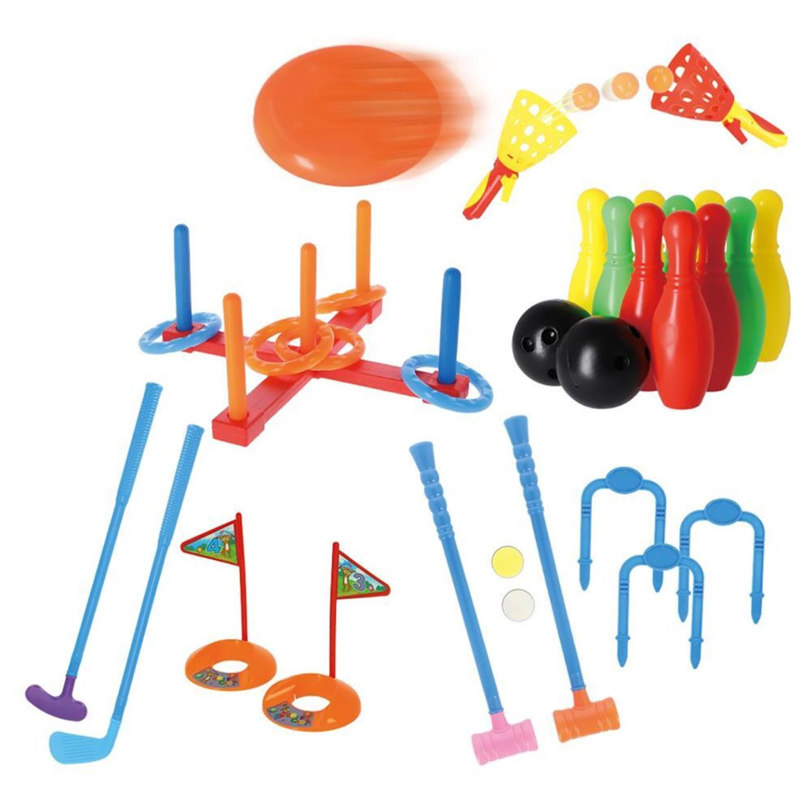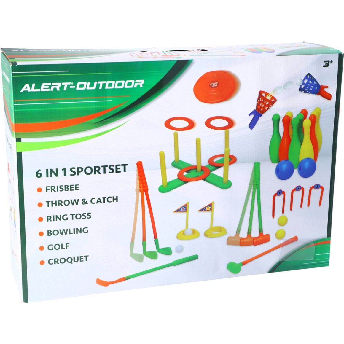 De Alert Outdoor 6-in-1 sportset biedt zes verschillende spellen in een compacte set voor gebruik buitenshuis. Ideaal voor spelen in de tuin, op het strand of tijdens een dagje uit. De set bevat onder andere onderdelen voor ringwerpen, bowling, frisbee en golf. Geschikt voor kinderen en volwassenen en eenvoudig mee te nemen.