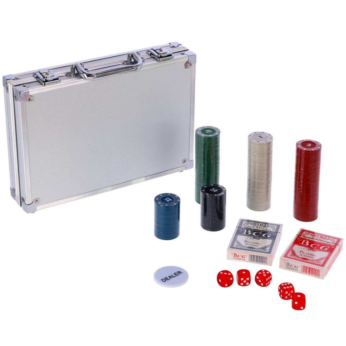 Complete pokerset in koffer met 200 onderdelen, inclusief 2 decks speelkaarten, fiches, dobbelstenen en een dealer button. De stevige koffer zorgt voor overzichtelijke opslag en eenvoudig transport. Geschikt voor verschillende kaartspellen en pokeravonden, zowel voor beginners als ervaren spelers.