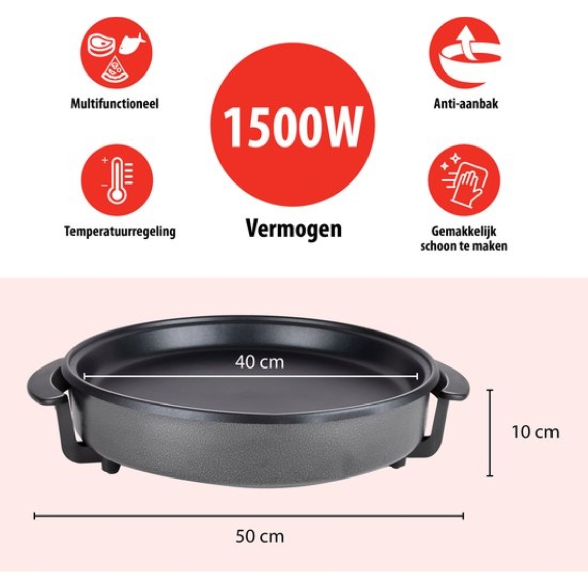 Elektrische hapjespan met een diameter van 40 cm en een vermogen van 1500W, geschikt voor het bereiden van grotere porties. Voorzien van een instelbare thermostaat en controlelampje voor nauwkeurige temperatuurregeling. De pan heeft een antiaanbaklaag en een glazen deksel met stoomgat. Uitgerust met cool-touch handgrepen en geschikt voor bakken, braden en warmhouden van diverse gerechten.