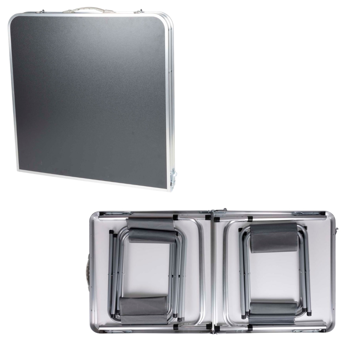 Inklapbare campingtafel met krukjes, bestaande uit een 5-delige set met een tafel en vier zitplaatsen. De tafel heeft een afmeting van circa 120 x 60 cm en is compact op te vouwen voor eenvoudig transport. Ideaal voor gebruik op de camping, tijdens picknicks of andere buitenactiviteiten. Voorzien van stevig frame en praktisch ontwerp voor snel opzetten en opbergen.