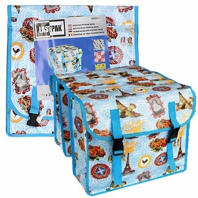 Fietstas dubbel met print blauw Parijs. Ruime dubbele fietstas van kunststof met trendy barok design, klittenband bevestiging en clip sluiting. Afmeting fietstas: ca. 2x 37x30x14 cm.