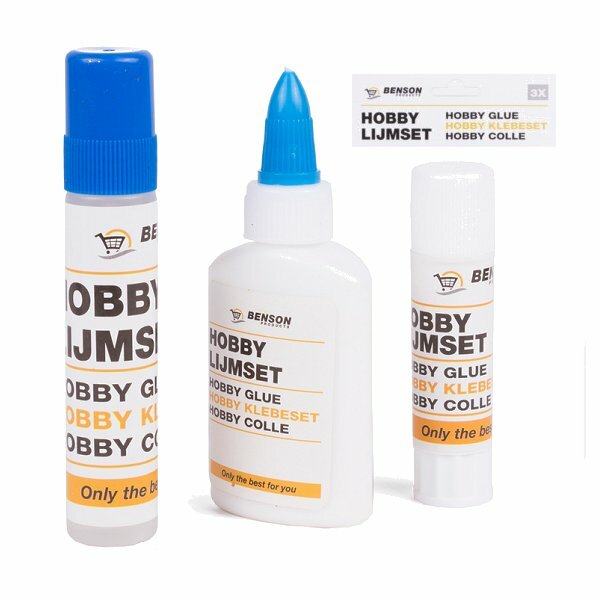 Deze hobbylijm set is ideaal voor bij het knutselen, de set bevat een flesje vloeibare lijm, een lijmroller en een lijmstift.