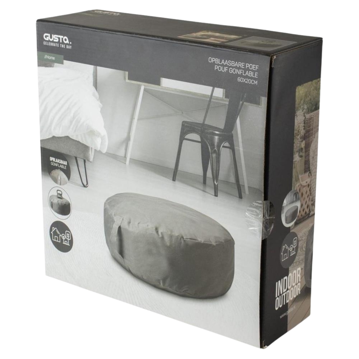 De Gusta opblaasbare poef in grijs heeft een diameter van 60 cm en is geschikt voor gebruik binnen en buiten. De poef is licht en eenvoudig te verplaatsen en kan belast worden tot 60 kg. Voorzien van een afneembare hoes met rits, waardoor schoonmaken en onderhouden eenvoudig is.