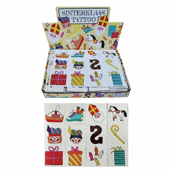 In een pakje zitten 12 verschillende kinder tattoos, o.a. van het paard, de Sint, de Pieten, cadeaus, de stoomboot, een schoen etc.