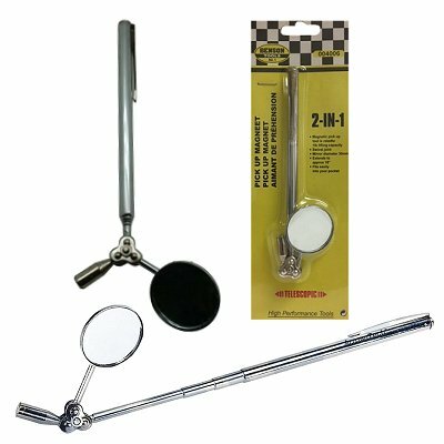 Magneet inspectiespiegel telescoop uitschuifbaar met draagclip. Met deze spiegel met uitschuifbare steel van 13 tot 49 cm kunt u op plekken kijken die normaal moeilijk zichtbaar zijn. De inspectiespiegel is 360 graden draaibaar en kan door het kogel schroefmechanisme in praktisch elke richting gezet worden. Ideaal voor het inspecteren van auto, motor, lichaam, het kijken achter kasten etc. De spiegel is voorzien van een magneet waarmee u gemakkelijk metalen voorwerpen kunt oprapen. Ingeschoven is de spiegel door het kleine formaat makkelijk overal mee te nemen. Afmeting: handspiegel doorsnede ca. 3 cm, totale lengte ca. 49 cm.