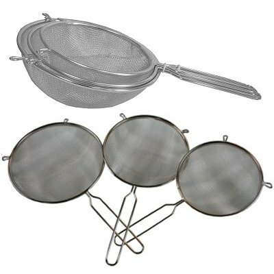 Keukenzeef metaal zeef set rvs 3 delig. Set met 3 metalen keukenzeven van roestvrijstaal met handvat en een doorsnede van 16, 18 en 21 cm. Afmetingen huishoudzeef metaal: ca. 16x29,5x4,5 cm, 18x34x5 cm en 21x35x5,5 cm.