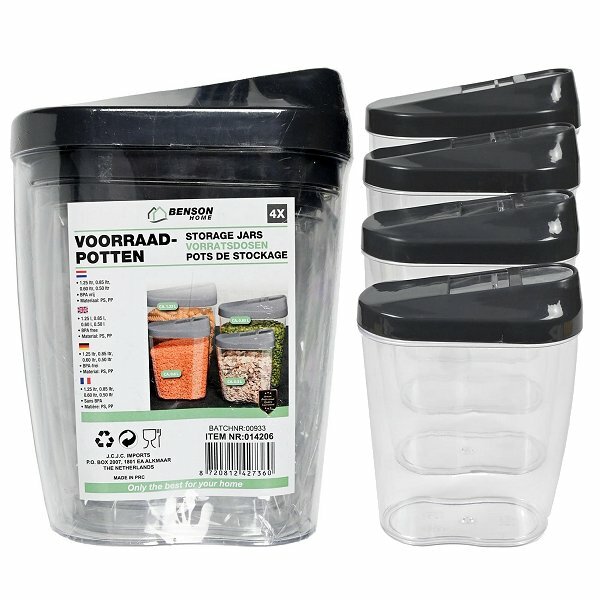 Voorraadbussen fooddispenser set 4 stuks. Set met 4 kunststof strooibussen met handige doseerschuif, ideaal voor het bewaren van suiker, hagelslag, kruiden, meel, rijst, deegwaren etc. De set bestaat uit een strooidoos met een inhoud van 0,5 liter, 0,6 liter, 0,85 liter, en een grote voorraadpot met een inhoud van 1,25 liter.