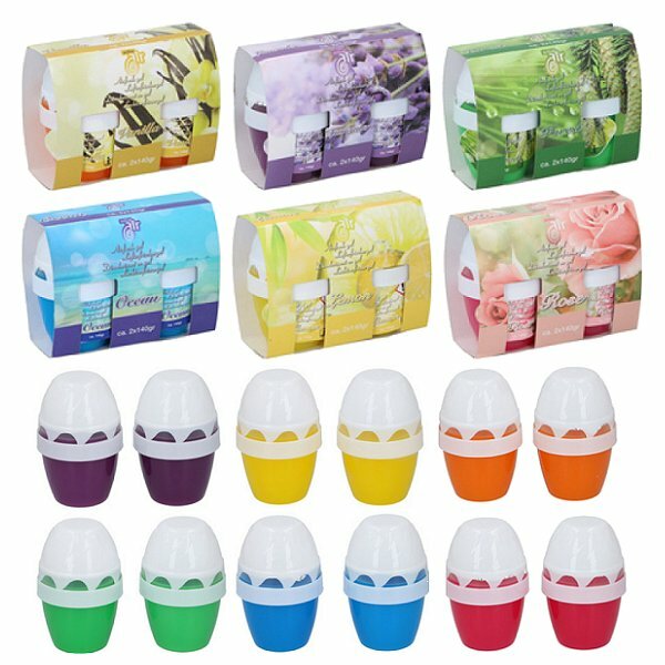 Luchtverfrisser staand ei vorm gel 2 x140 gram. Deze luchtverfrisser met aangename frisse geur kunt u gemakkelijk overal neerzetten, voor op het toilet, badkamer, kantoor, woonkamer, keuken etc. Wordt assorti geur uitgeleverd in lavendel, roos, vanille, lemon, forest, en/of ocean.