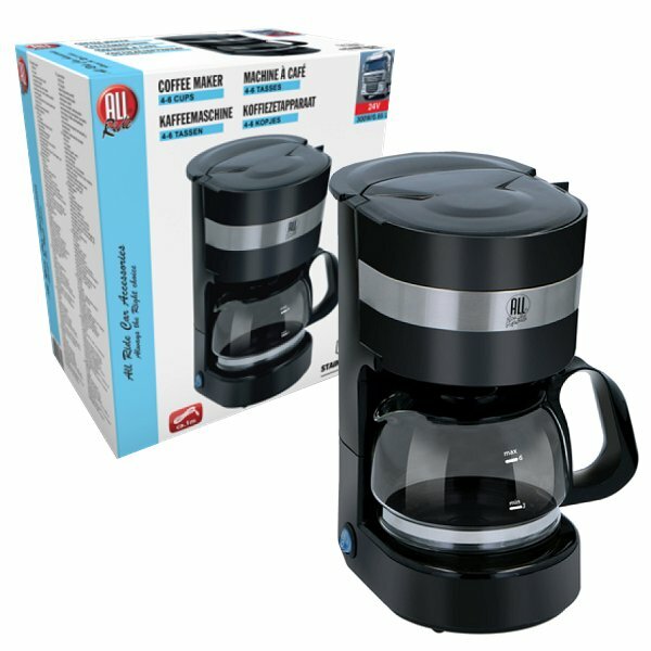 Koffiezetter vrachtauto 24 volt 300 watt Allride. Dit koffiezetapparaat met warmhoudplaatje kunt u in de vrachtwagen gebruiken, werkt via de sigarettenaansteker op 24 volt. Onderweg lekker uw eigen kopje koffie zetten. De koffiezetter heeft een glazen kan met een inhoud van 650 ml, een antidruppelklep, permanent filter en is geschikt voor 4-6 kopjes. Het apparaat is voorzien van een thermostaat en een oververhittingsbeveiliging.