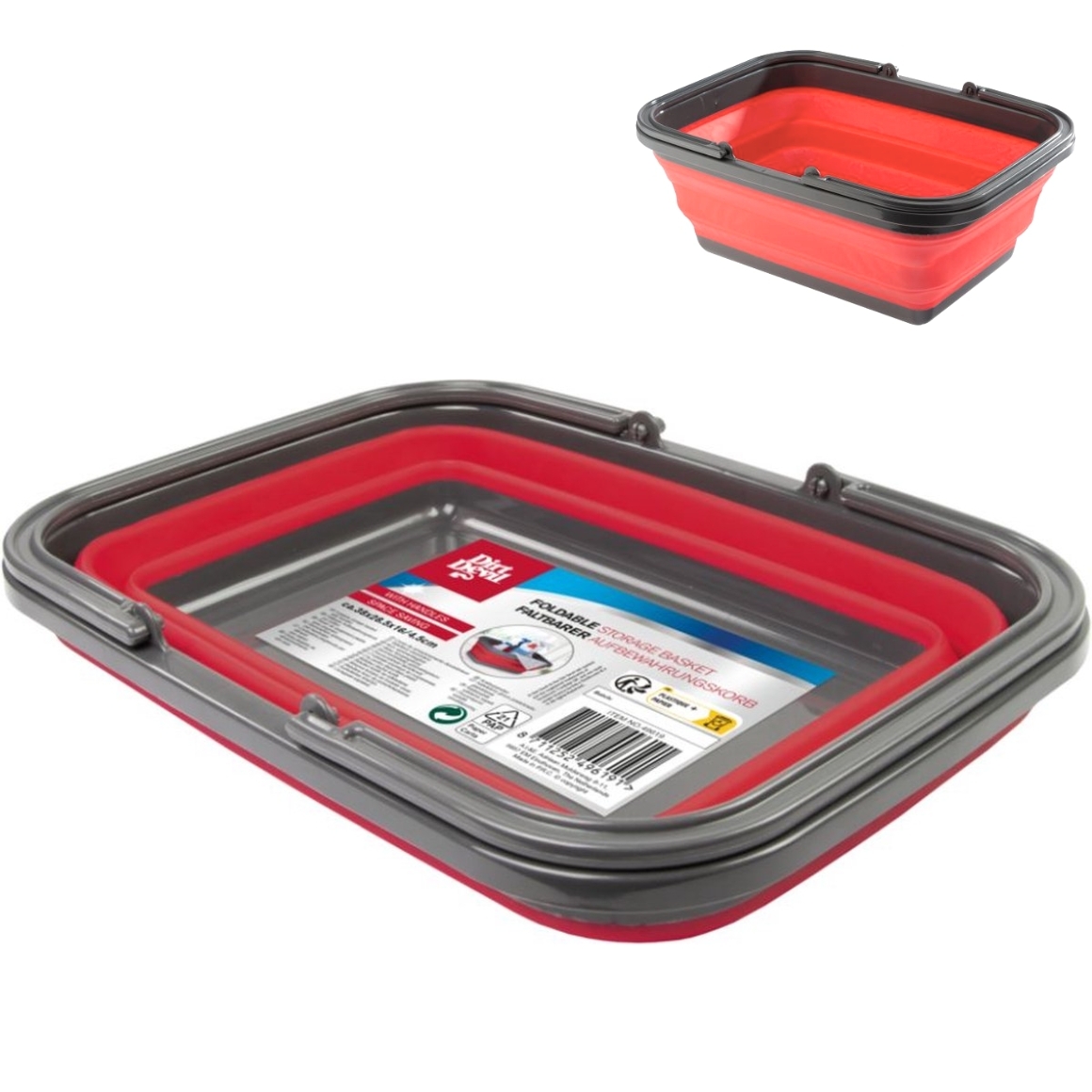 Opgevouwen heeft de mand een hoogte van 4,5 cm, uitgeklapt is de mand 16 cm hoog.