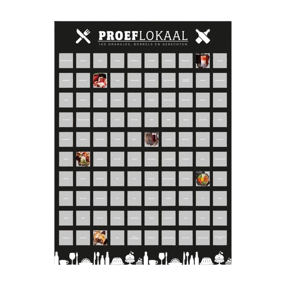 Met deze krasposter kun je bij houden welke gerechten en dranken je hebt genuttigd en welke je nog eens zou kunnen proberen.