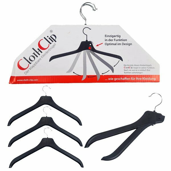 Cloth Clip kledinghangers zwart 3 stuks. Past je normale kleerhanger niet door het gat van een shirt of blouse? dan is dit de oplossing. Deze superhandige kunststof kledinghangers zijn vouwbaar, klap ze in, doe de hanger eenvoudig door het gat van het shirt en klap deze weer uit. Afmeting gevouwen: ca. 29x16x2 cm.