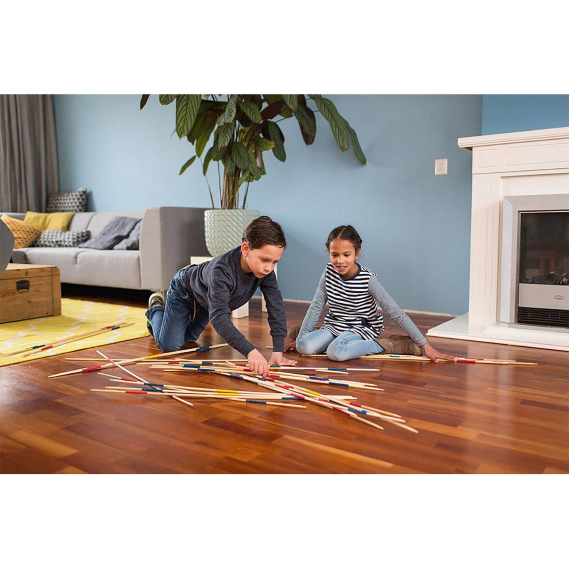 Mikado XXL van het merk BS Toys. Het spel bevat 31 bamboe stokken, met een diameter van 0,75 cm en een lengte van 90 cm. Het spel is niet geschikt voor kinderen jonger dan 36 maanden.