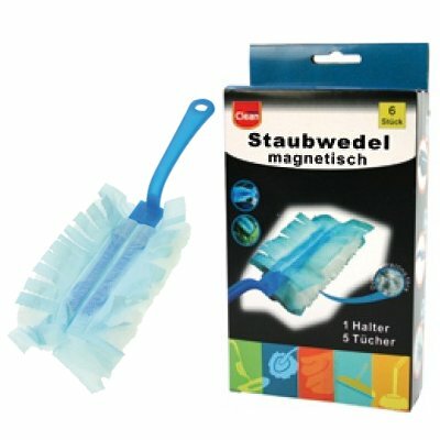 Clean magnetische afstoffer 6 delig. Deze stoffers zijn electrostatisch geladen, waardoor het stof aangetrokken wordt en niet direkt weer neer dwarrelt. Deze dusters halen het stof uit de moeilijkst bereikbare plekjes, de vervanging van de stofdoek, de ideale manier van afstoffen. De set staat uit 1 houder en 5 statische dusters. Afmeting: ca. 29x11x3 cm.