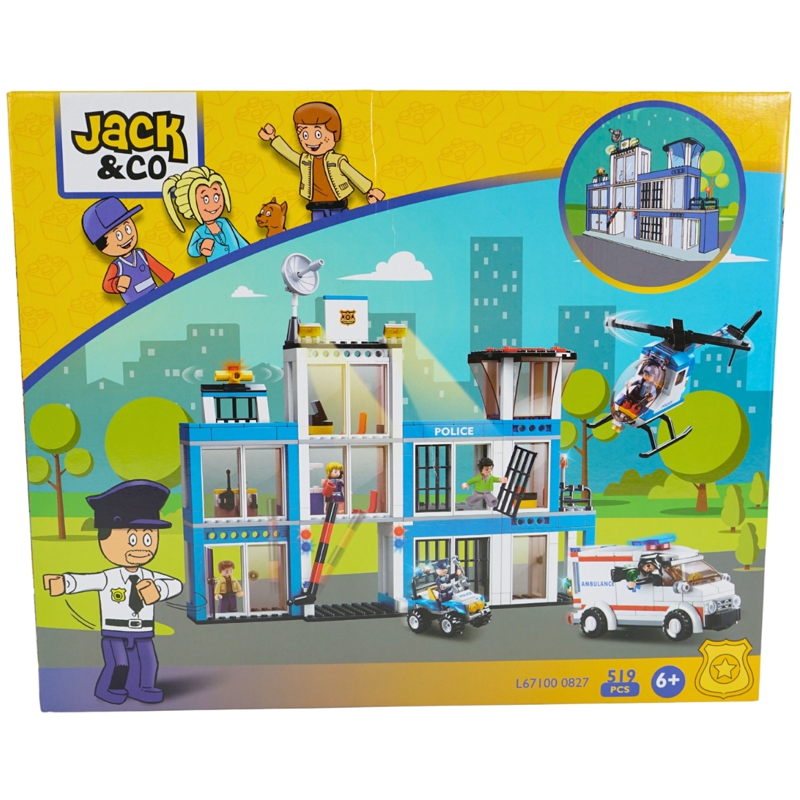 Bouwpakket met bouwstenen van het merk Jack & Co. Het politiebureau bevat 519 onderdelen. Indien volledig opgebouwd is het politiebureau 32 cm breed en 27 cm hoog. Aanbevolen voor kinderen vanaf 6 jaar. Jack & Co bouwstenen zijn niet geschikt voor kinderen jonger dan 36 maanden. Figuren afgebeeld op de doos zijn niet inbegrepen.