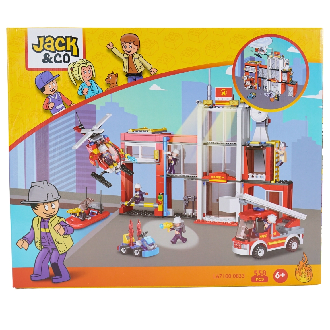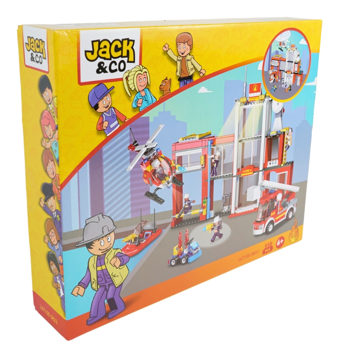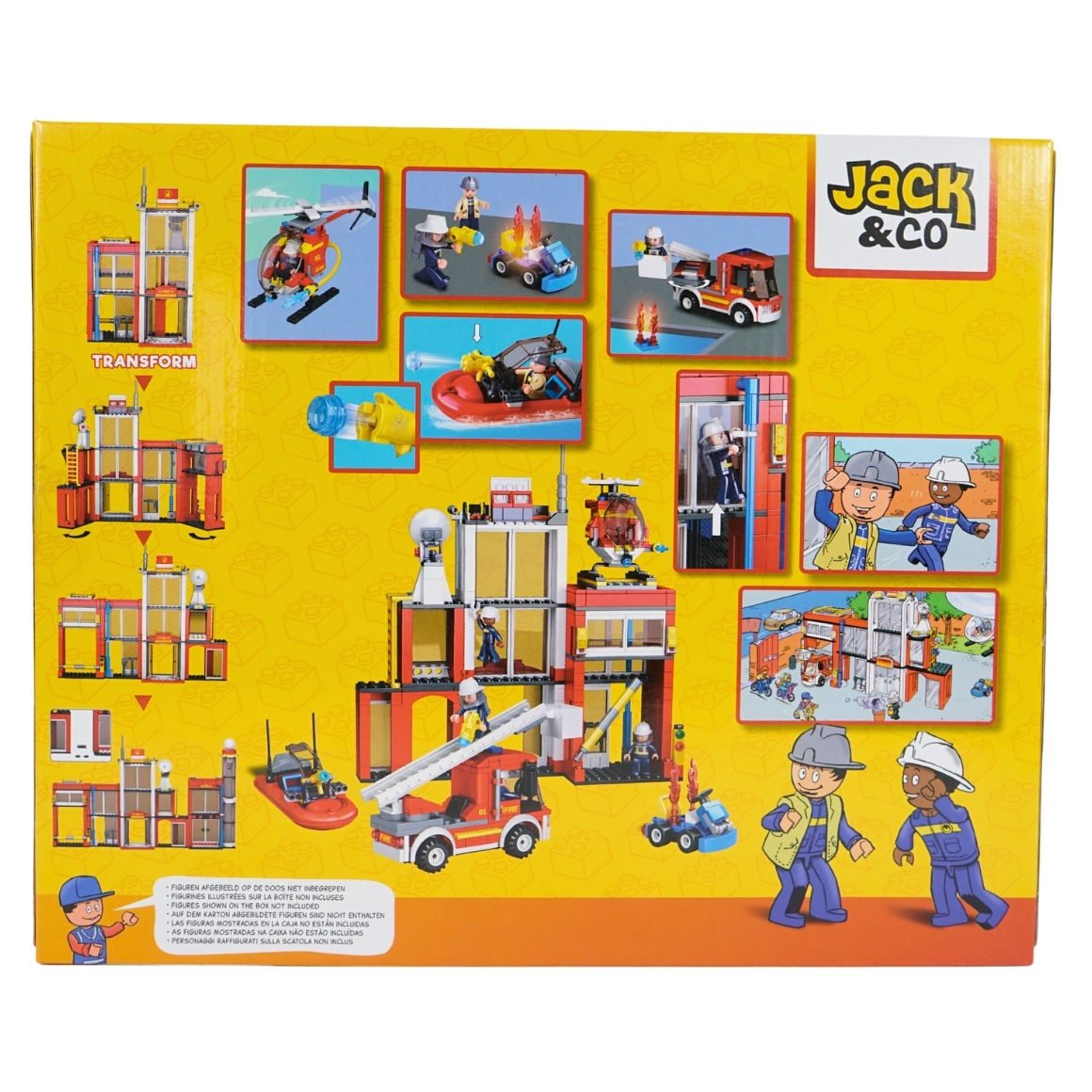 Bouwpakket met bouwstenen van het merk Jack & Co. De Brandweer kazerne bevat 558 onderdelen. Indien volledig opgebouwd is de Brandweer kazerne 32 cm breed en 27 cm hoog. Aanbevolen voor kinderen vanaf 6 jaar. Jack & Co bouwstenen zijn niet geschikt voor kinderen jonger dan 36 maanden. Figuren afgebeeld op de doos zijn niet inbegrepen.